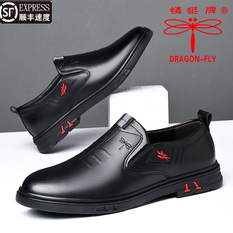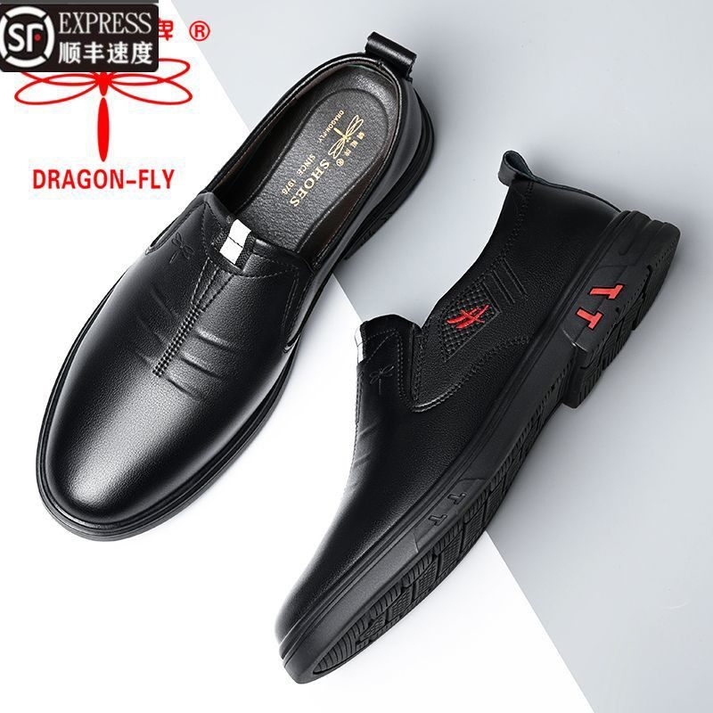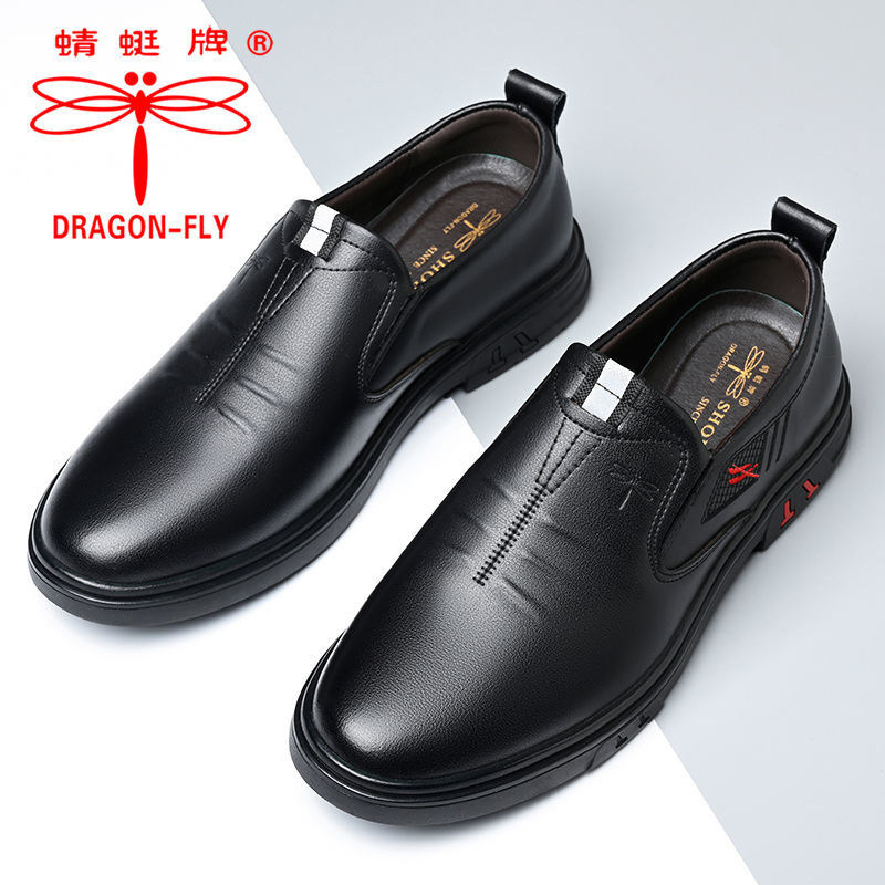 红清蜓2025新款商务男士皮鞋透气软底一脚蹬软面休闲鞋黑色加绒