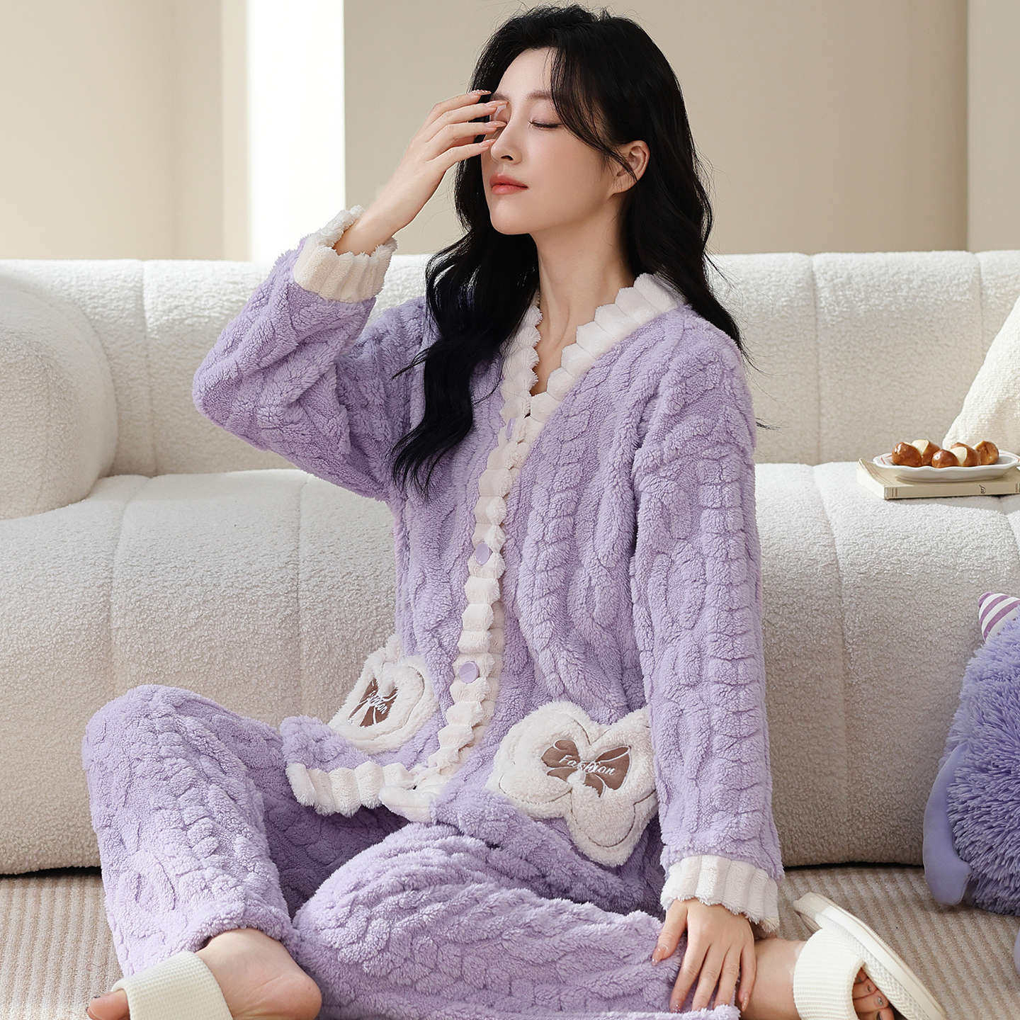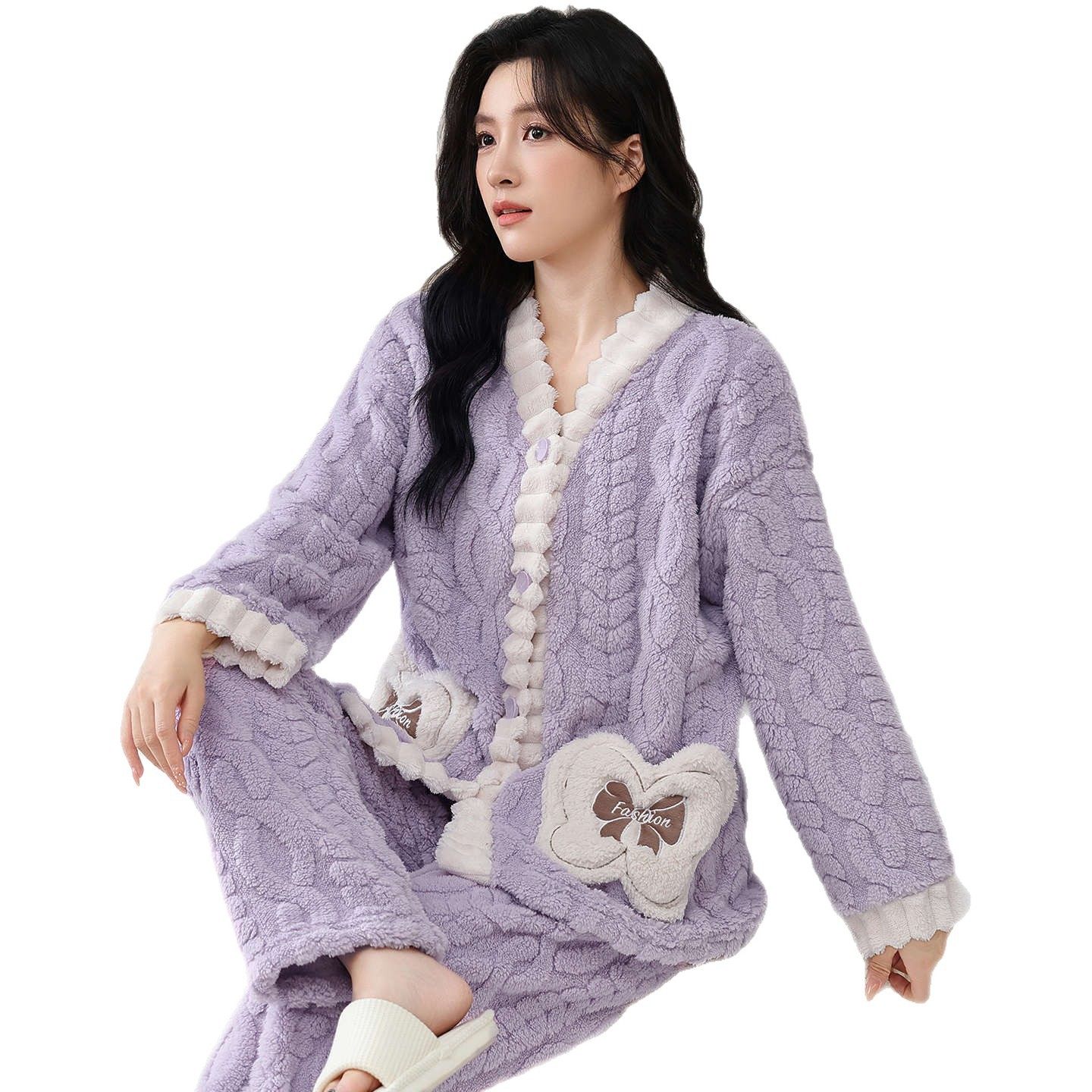 睡衣女士冬加绒加厚珊瑚绒保暖紫色高级感开衫家居服可外穿抗静电