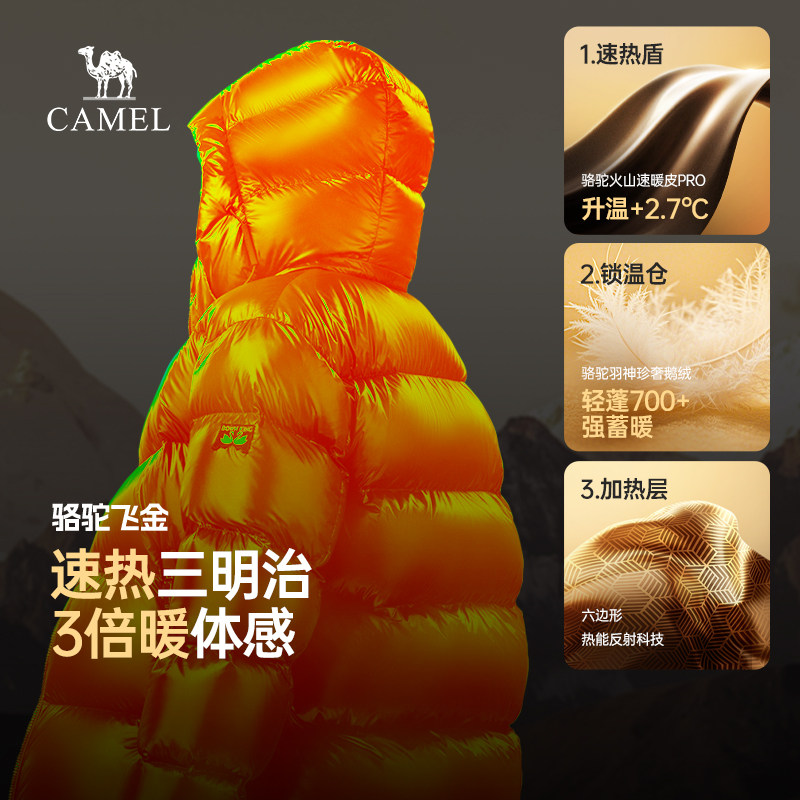 骆驼火山速暖皮飞金鹅绒服男女2025冬黑色亮面保暖防风羽绒服