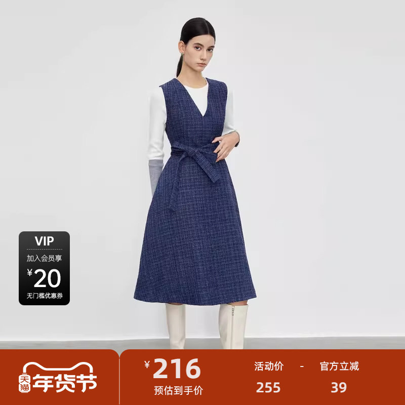 sdeer圣迪奥女装小香风套装V领格纹收腰无袖连衣裙S23461201