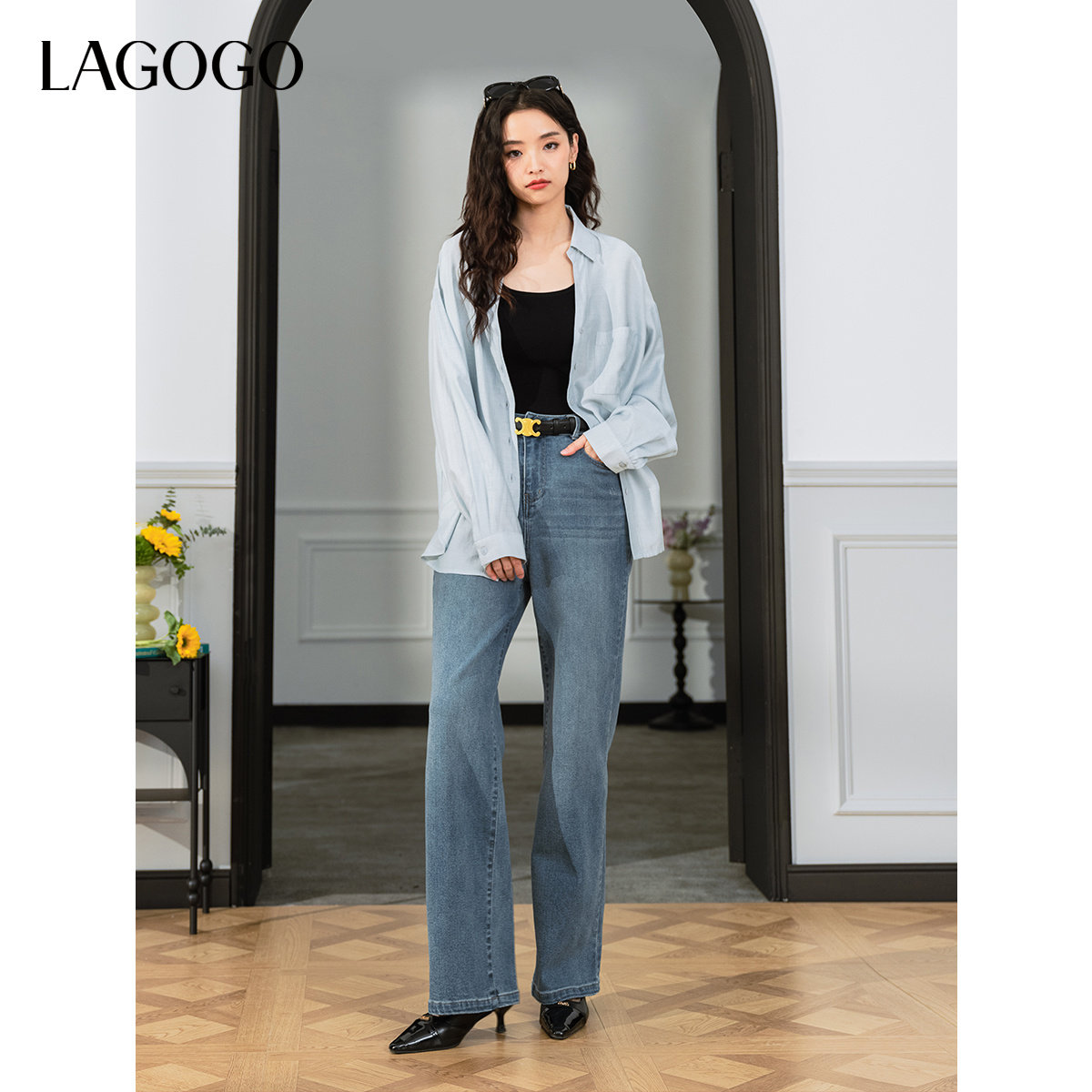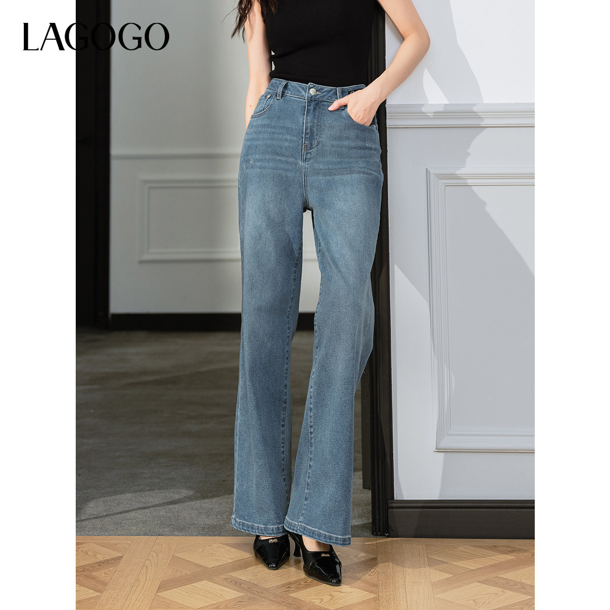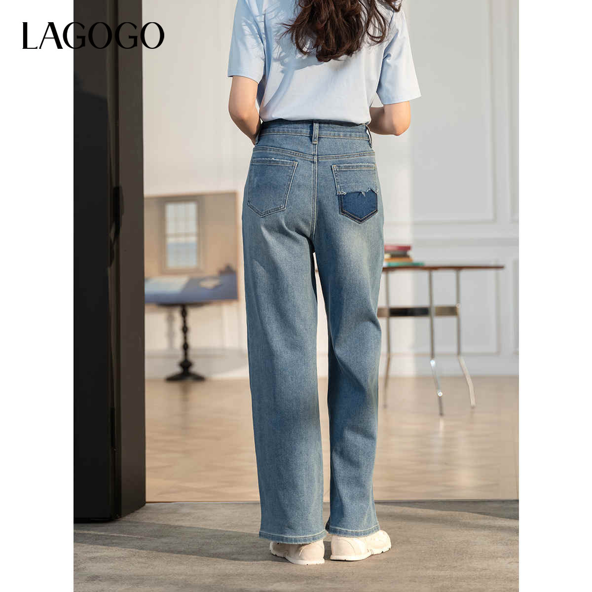 LAGOGO高腰显瘦流行牛仔裤女拉谷谷2025秋冬新款撞色口袋直筒裤