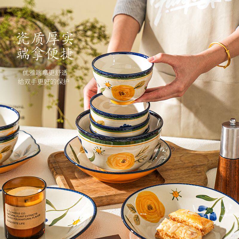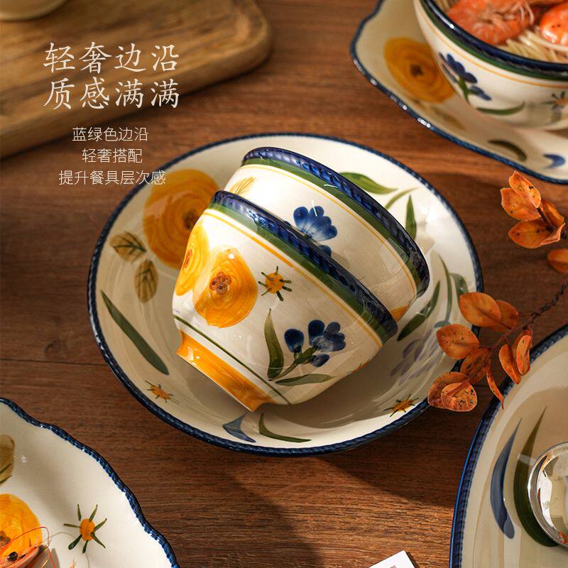 陶瓷家用碗盘子手绘美式时尚餐具釉下彩加深汤碗微波炉用花前悦语
