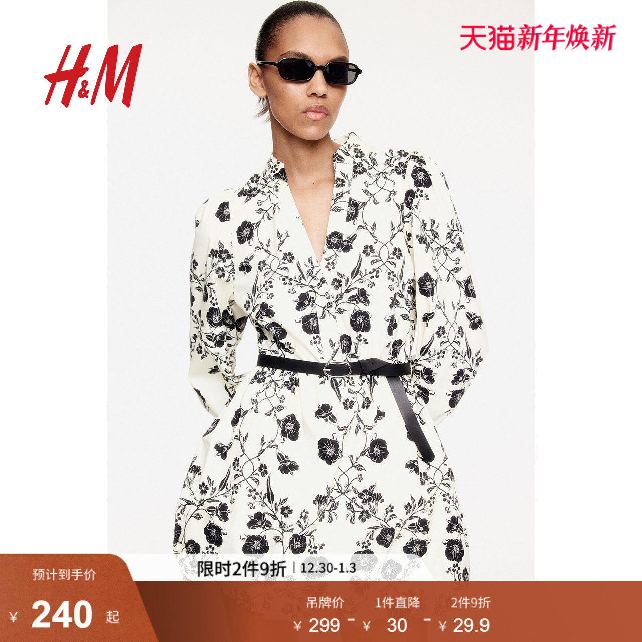 HM女装花卉连衣裙2025冬新款配腰带泡泡下摆设计感碎花裙1272211