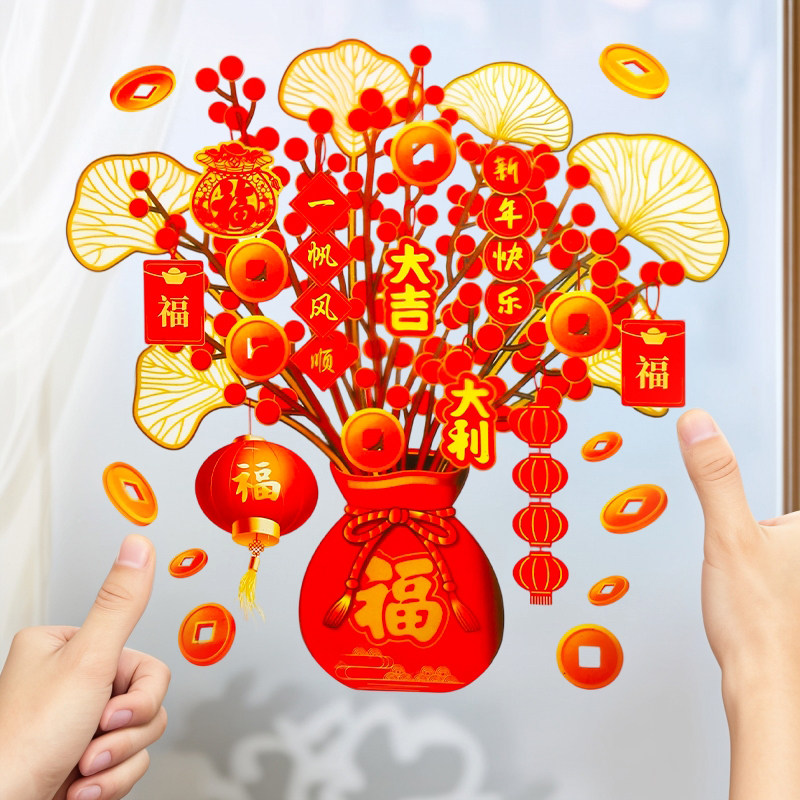 2025新年过年装饰发财树窗花贴福袋门贴玻璃贴纸蛇年春节静电贴画