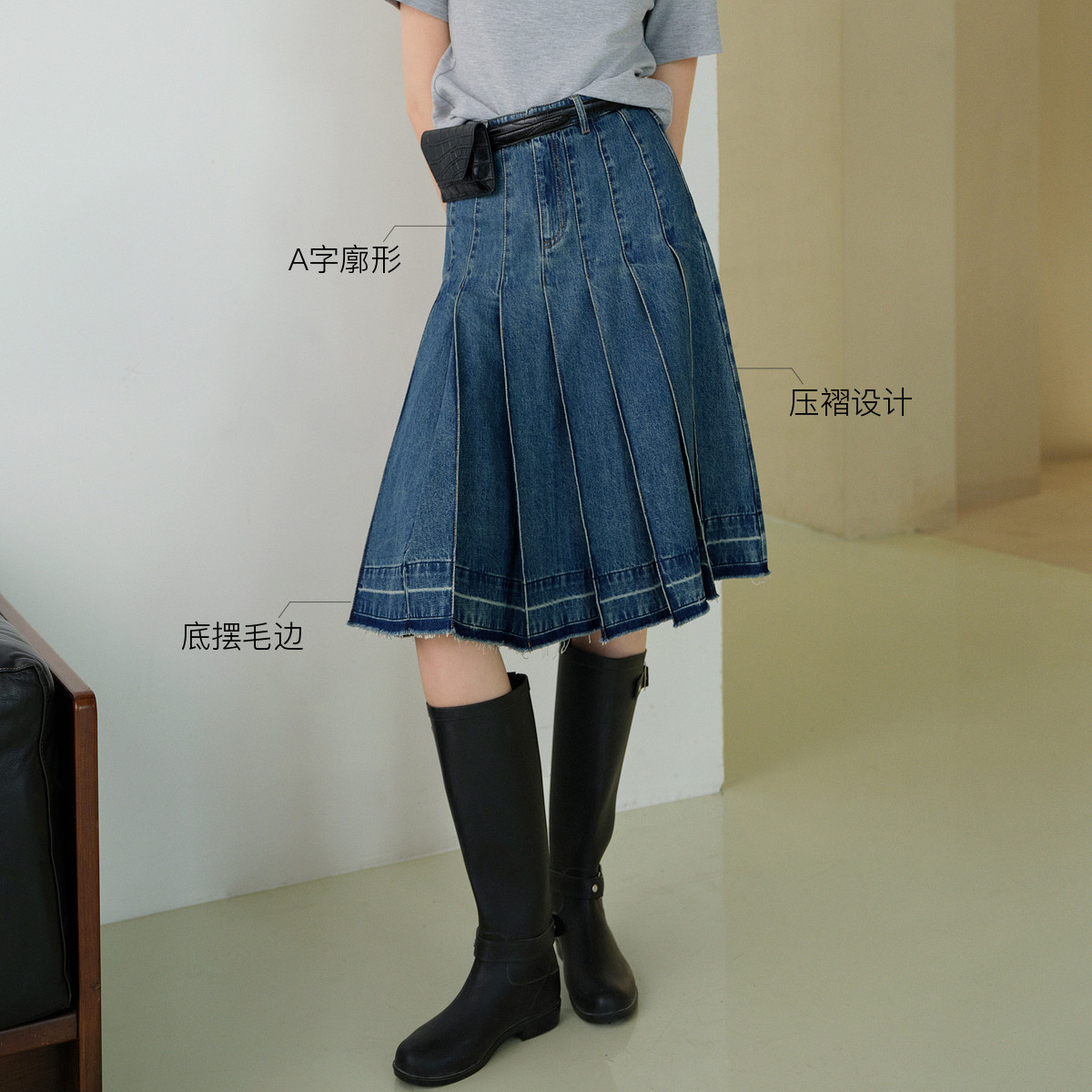 【商场同款】ELLE纯棉牛仔半身裙女2025冬季新款小个子百褶裙子
