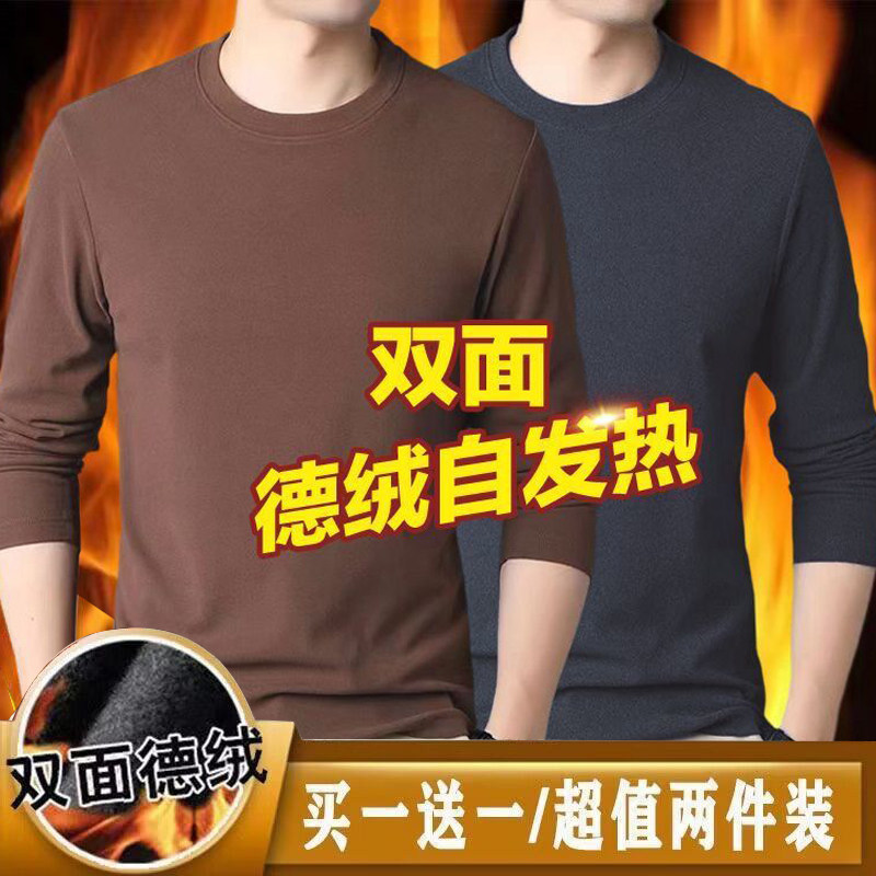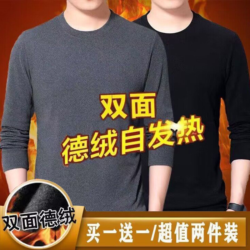 德绒圆领打底衫男2025秋冬季保暖潮内搭t黑色半秋衣长袖T恤双面