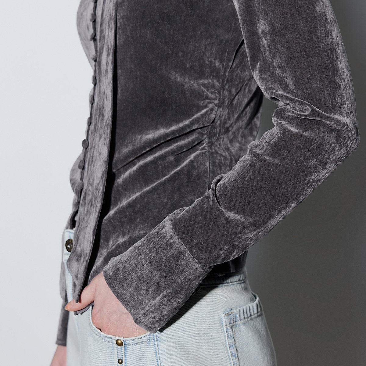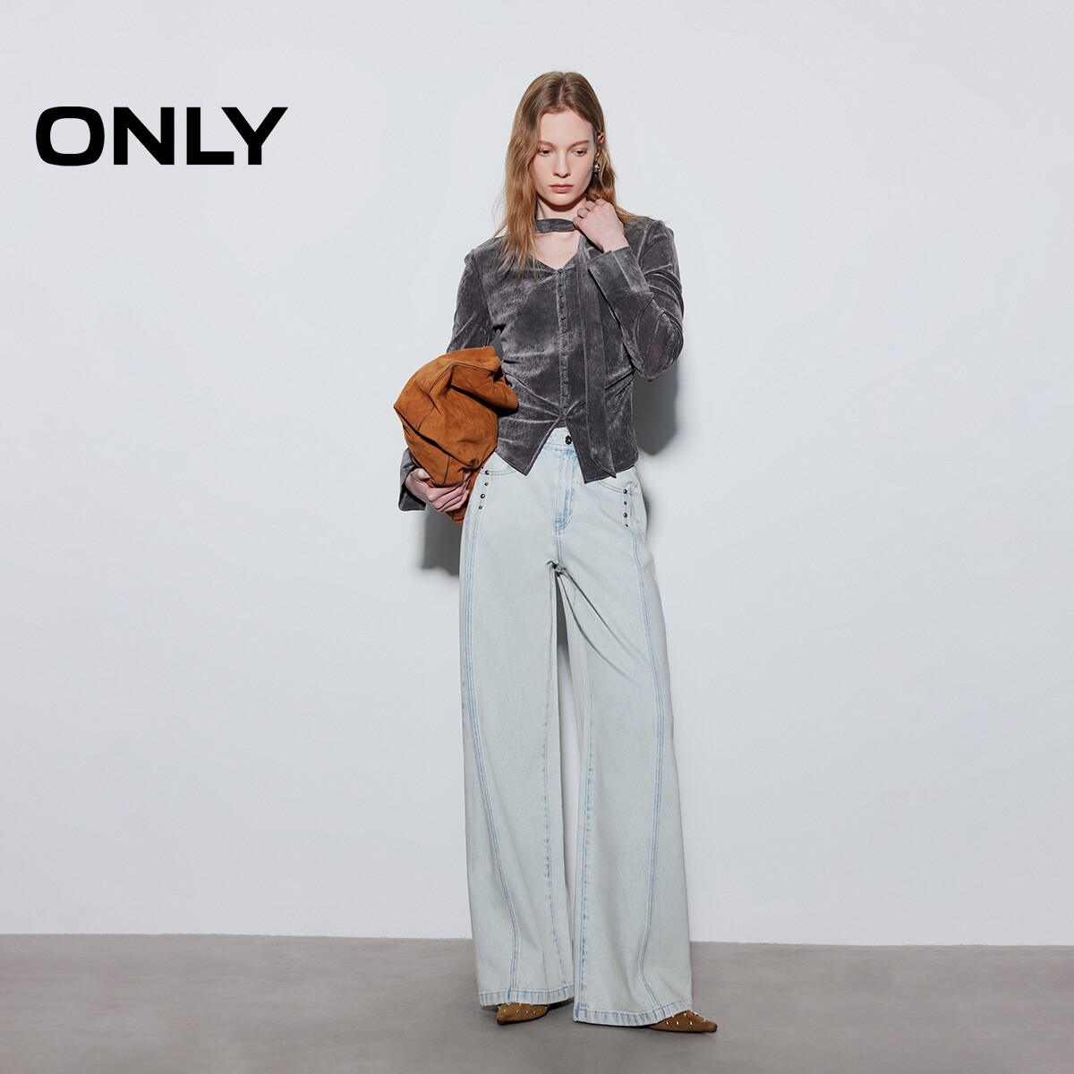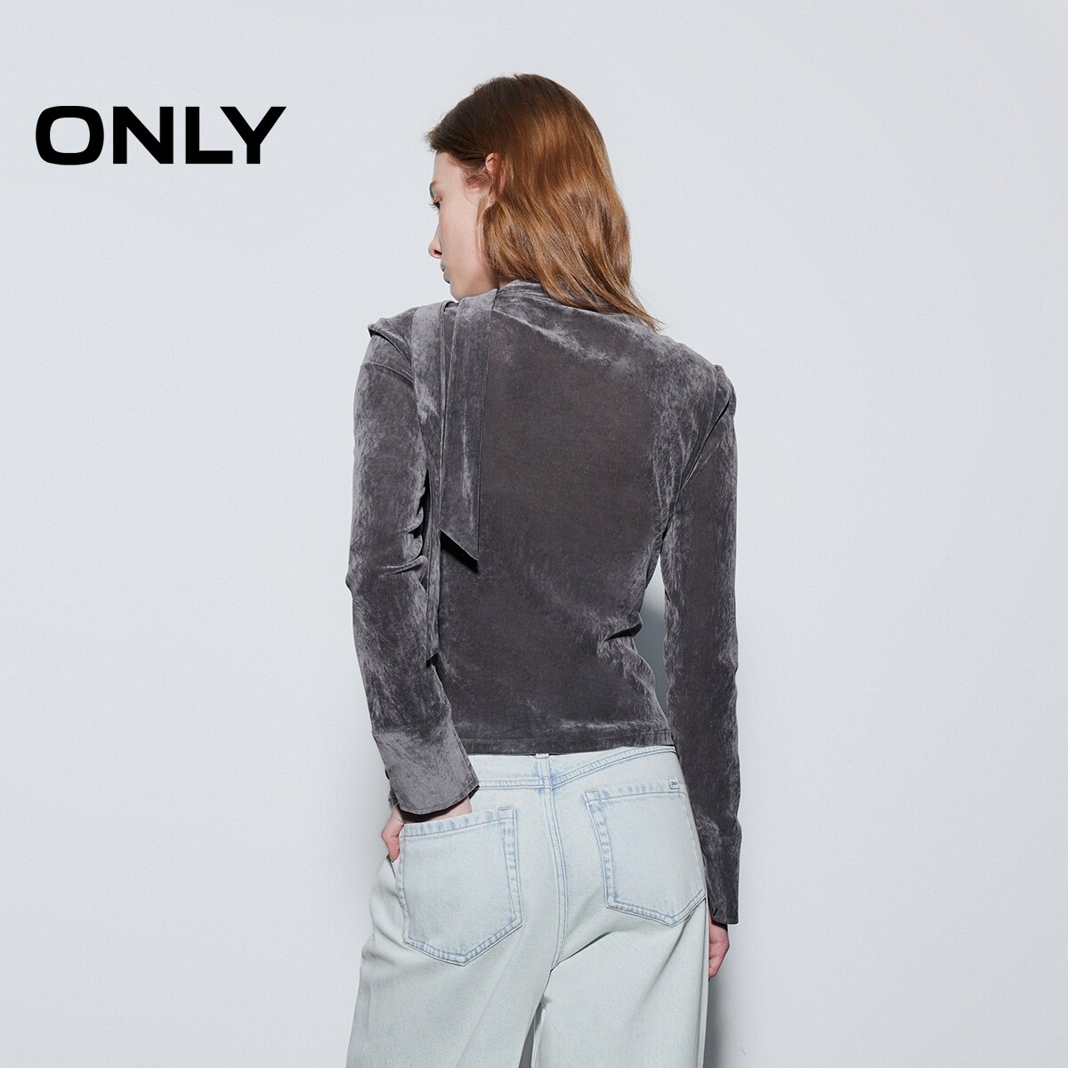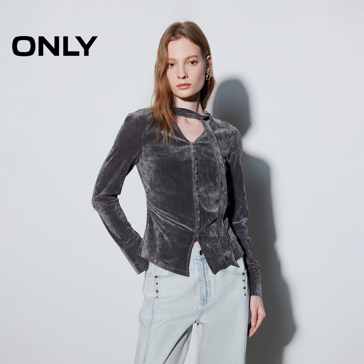 ONLY2026春季新款侧腰收褶排扣长袖V领颈间飘带修身丝绒上衣T恤女