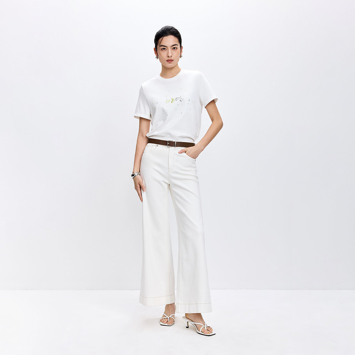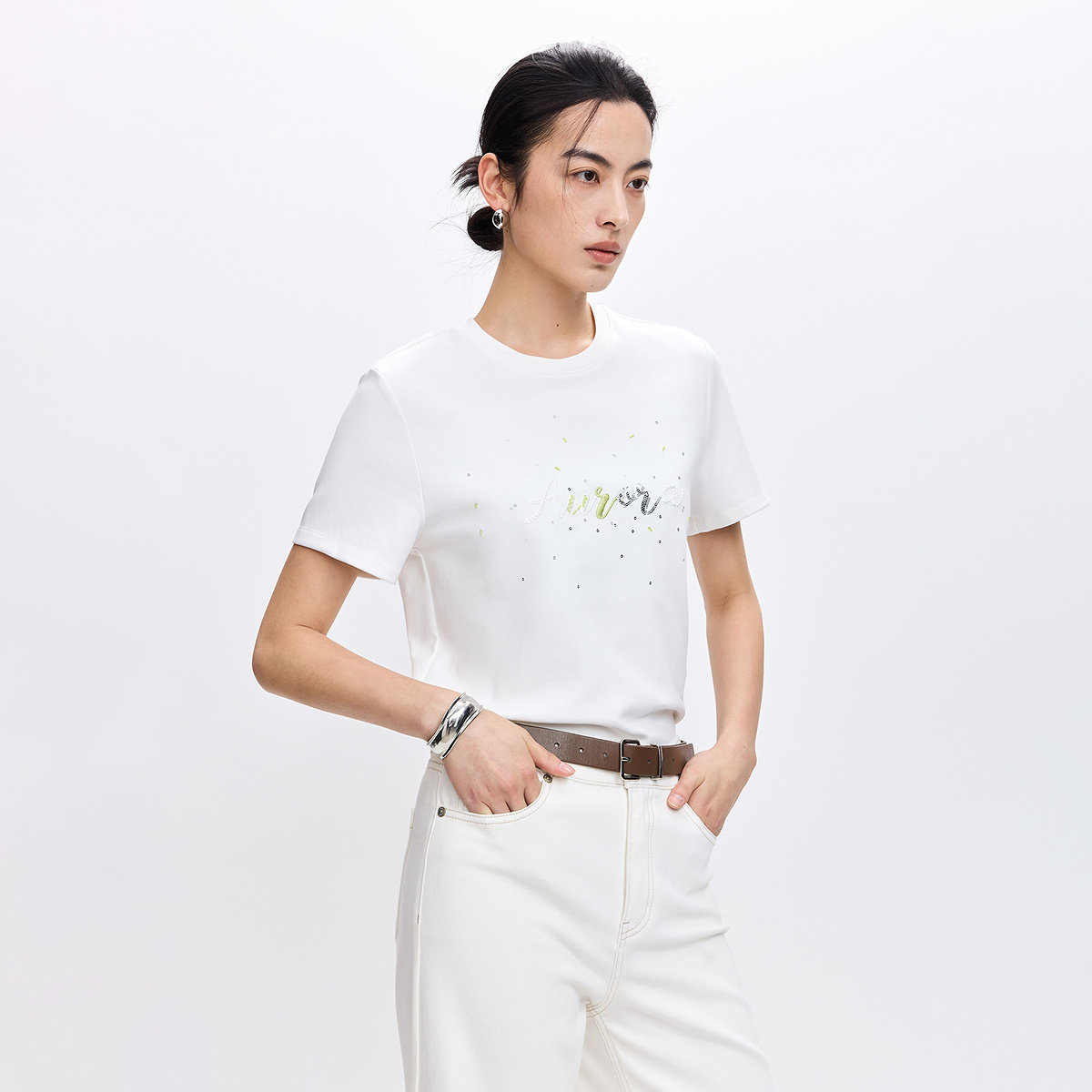 LILY2026春新款女装欧若风撞色刺绣珠片正肩休闲通勤白色短袖T恤