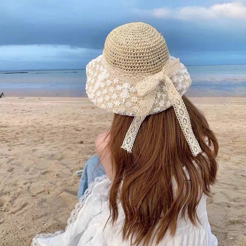 草帽女新款日系小清新蕾丝草编帽子夏季出游防晒帽大檐沙滩遮阳帽