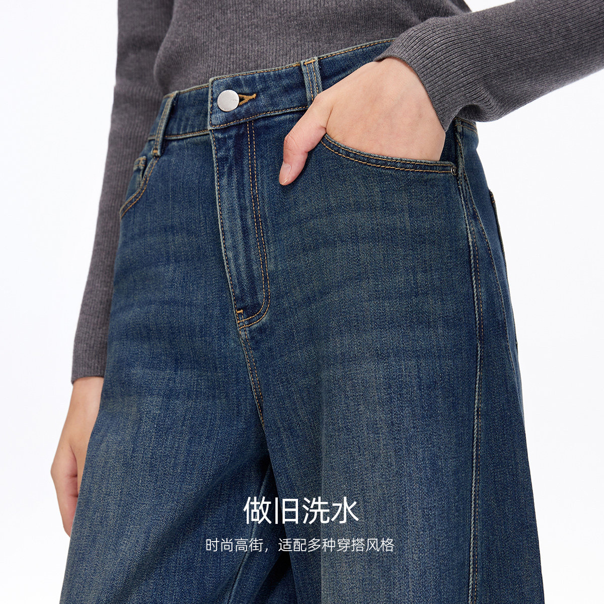 三福牛仔长裤2025新款冬季磨毛阔腿裤复古深色宽松裤子女装512304
