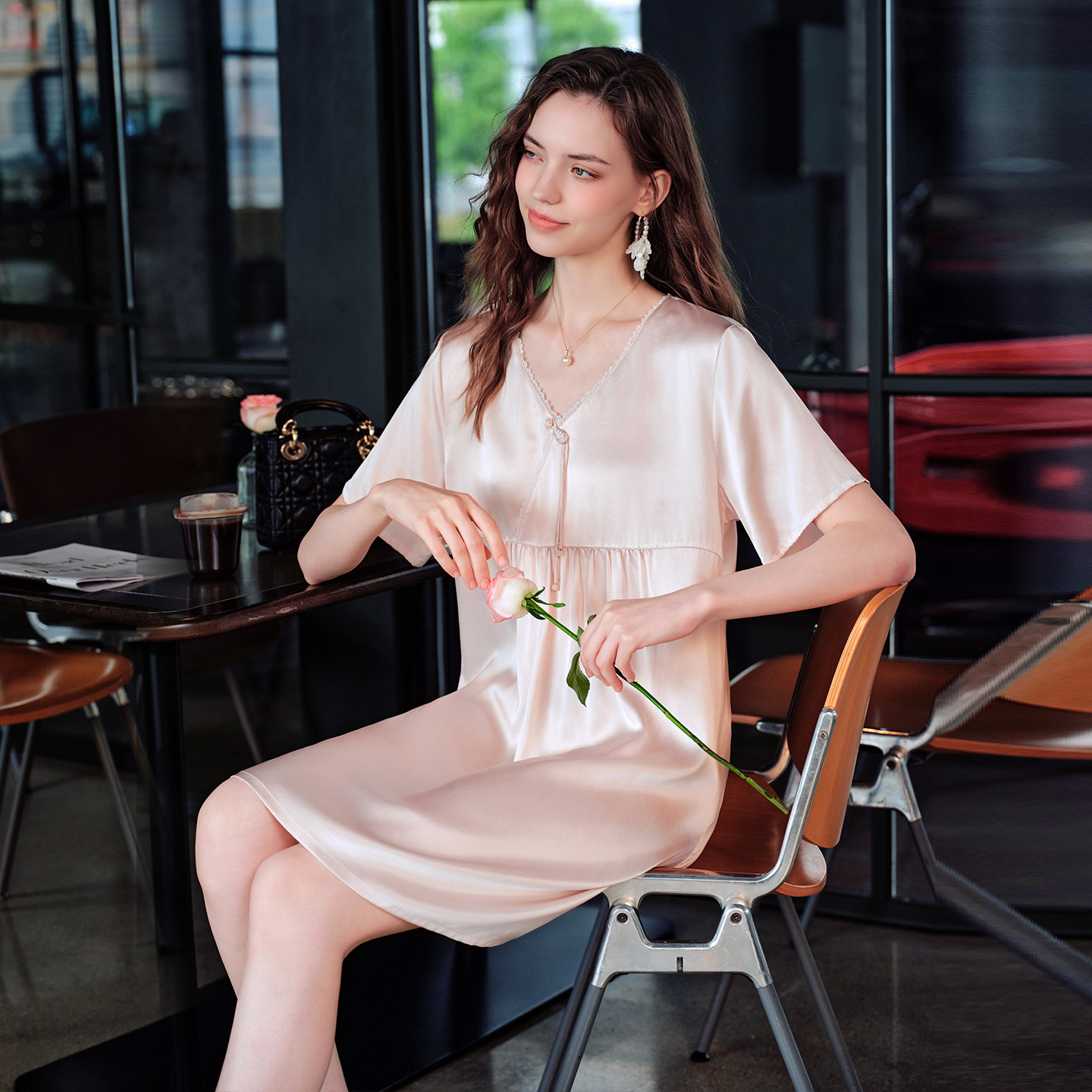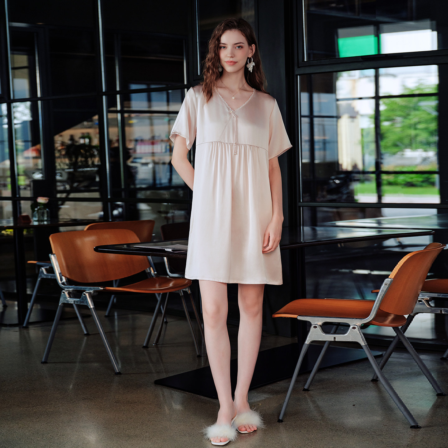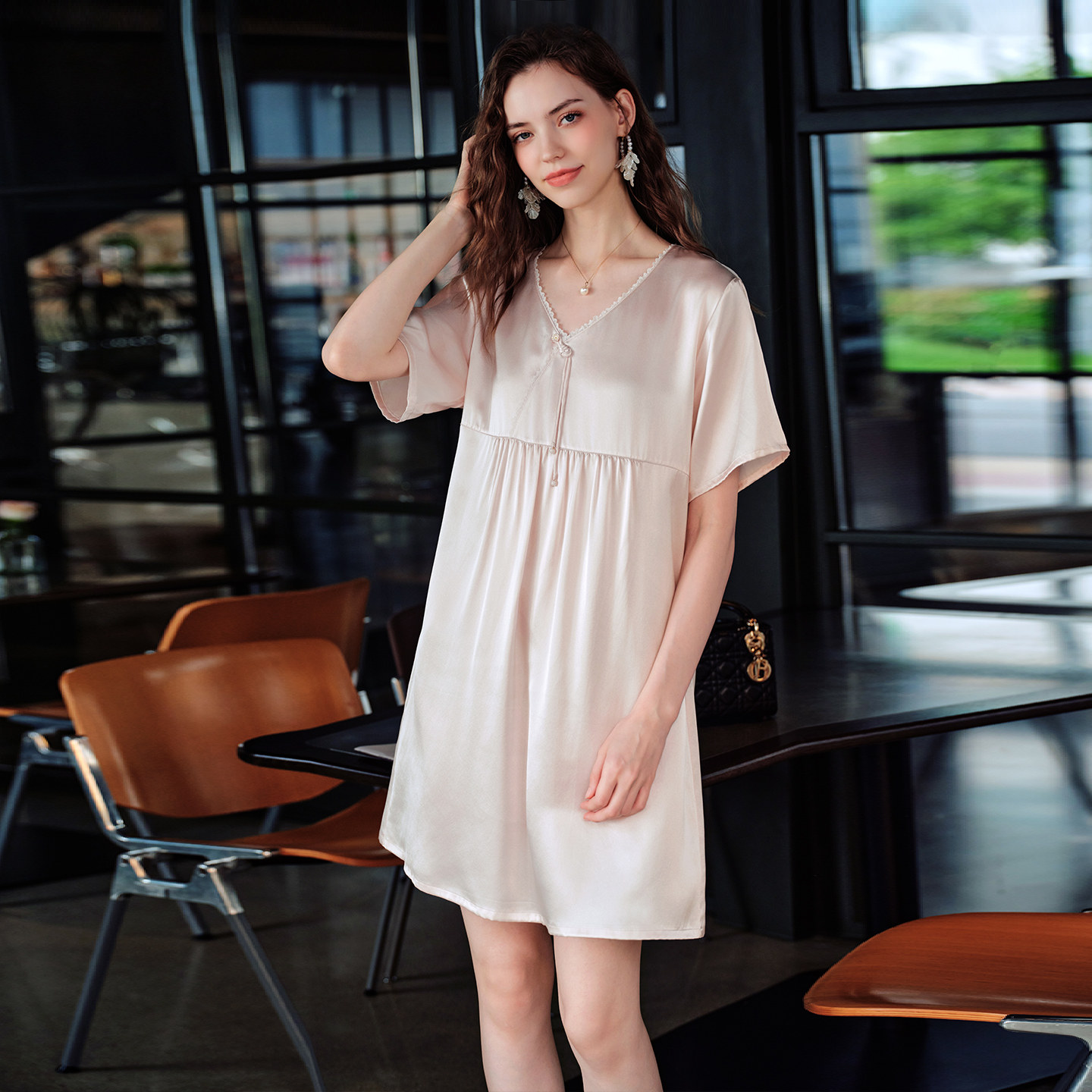 美标真丝睡衣女士中袖短睡裙性感19姆米桑蚕丝家居服丝绸连衣裙