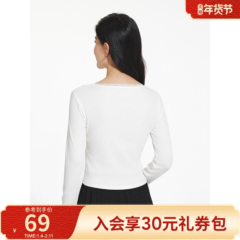 热风2025年秋季新款女士蕾丝大圆领长T甜美百搭修身短款长袖上衣