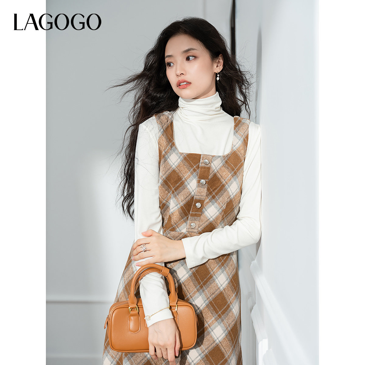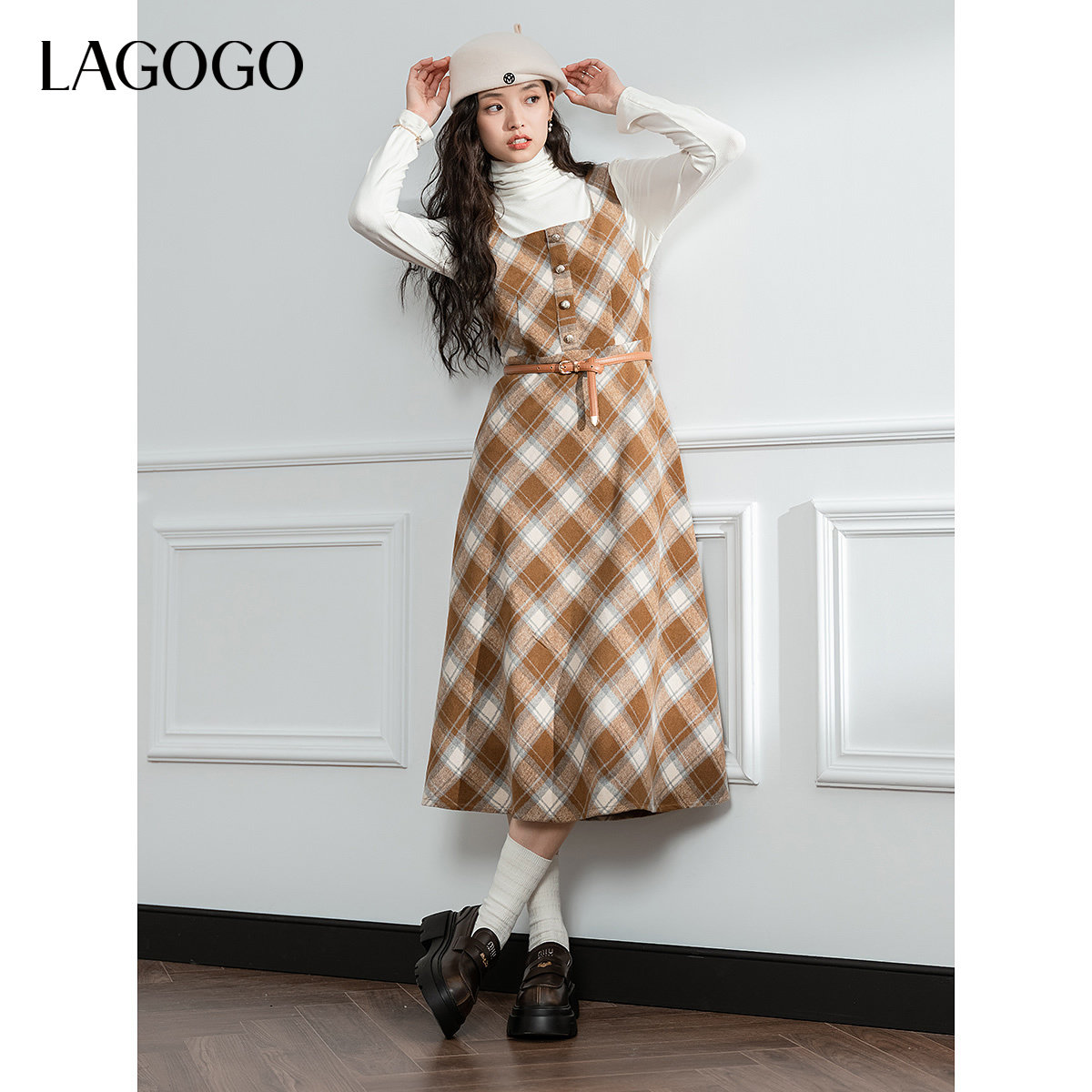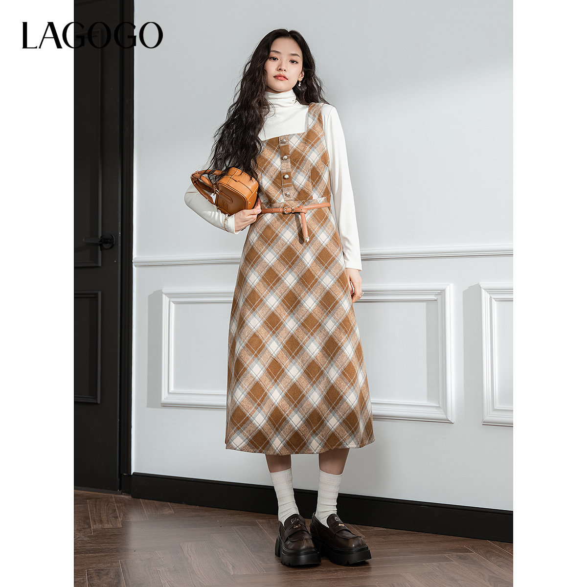 LAGOGO复古格纹连衣裙女拉谷谷冬季新款收腰长款背心裙子