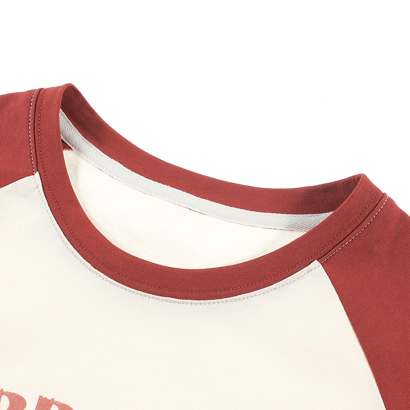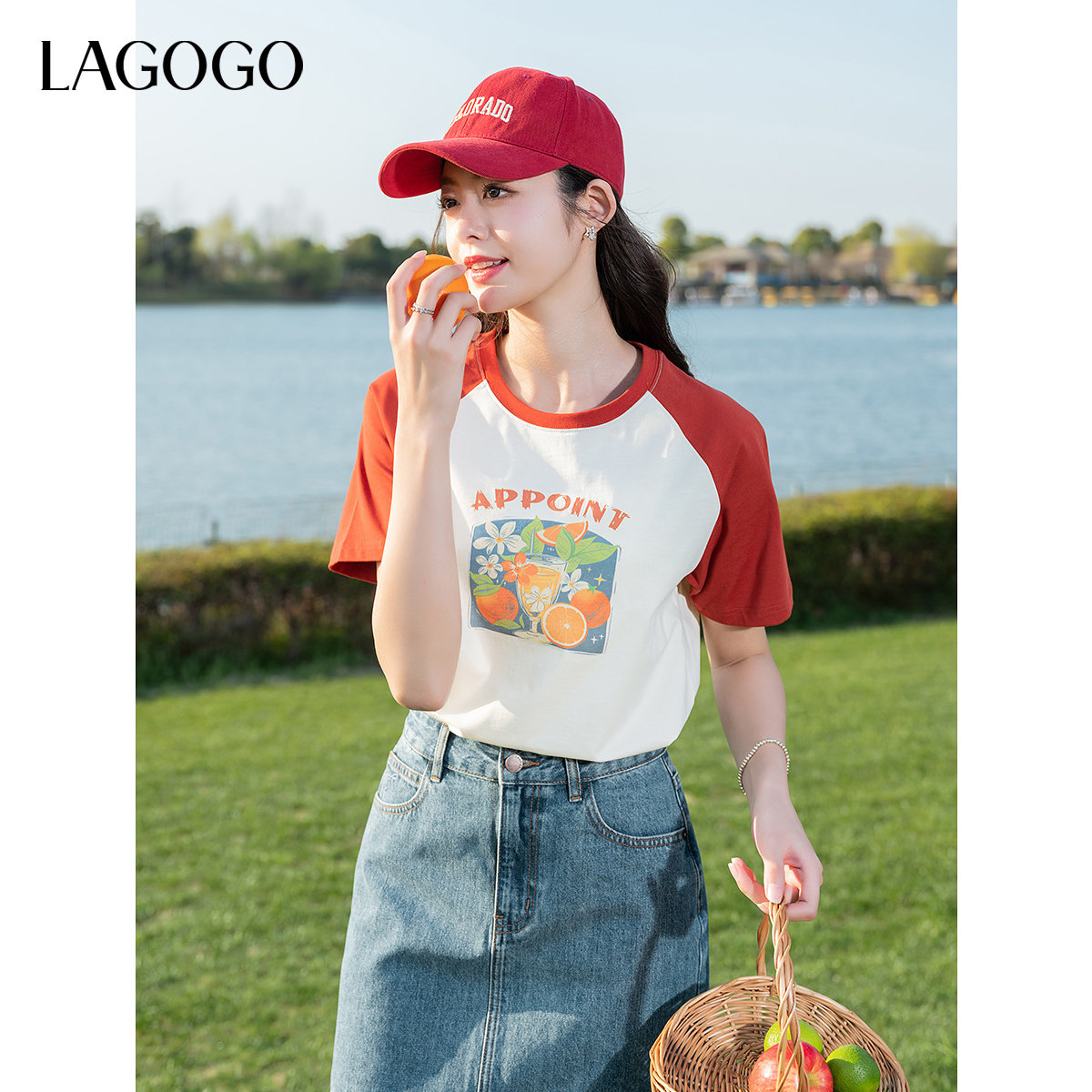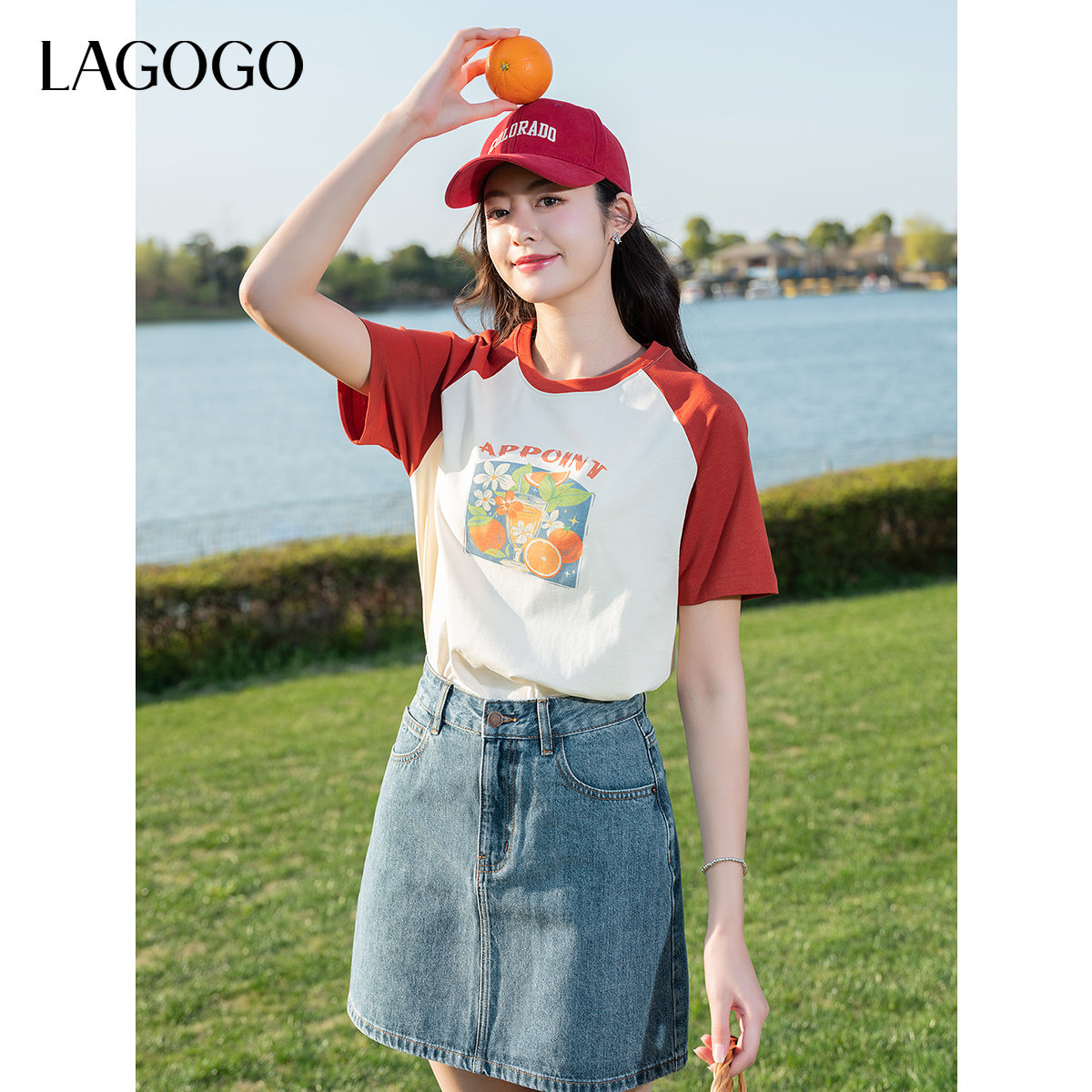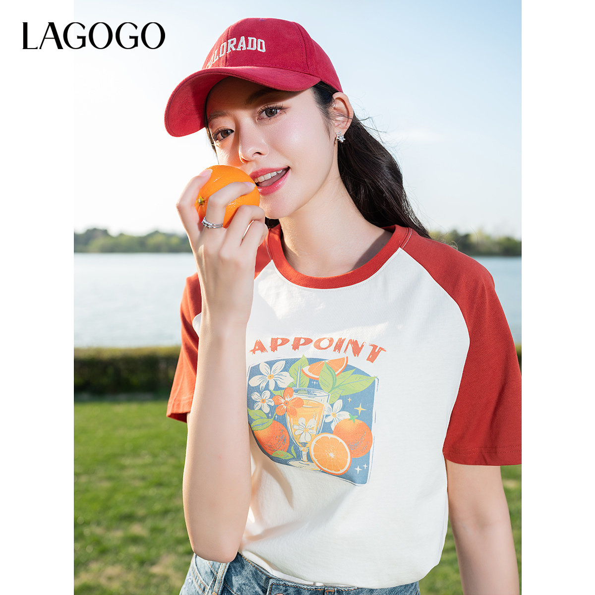 LAGOGO红色插肩袖水果印花T恤女拉谷谷2025年夏季新款纯棉短袖