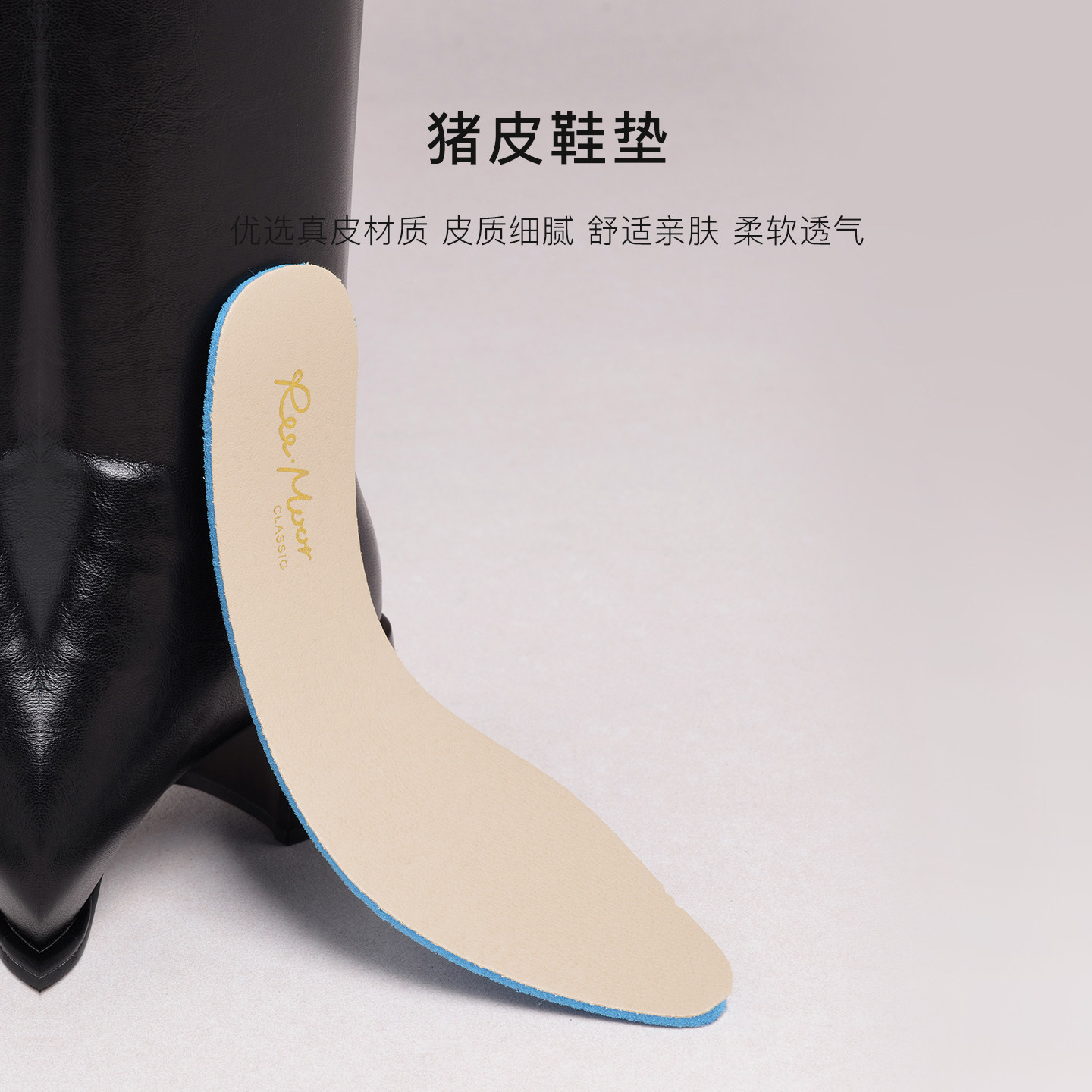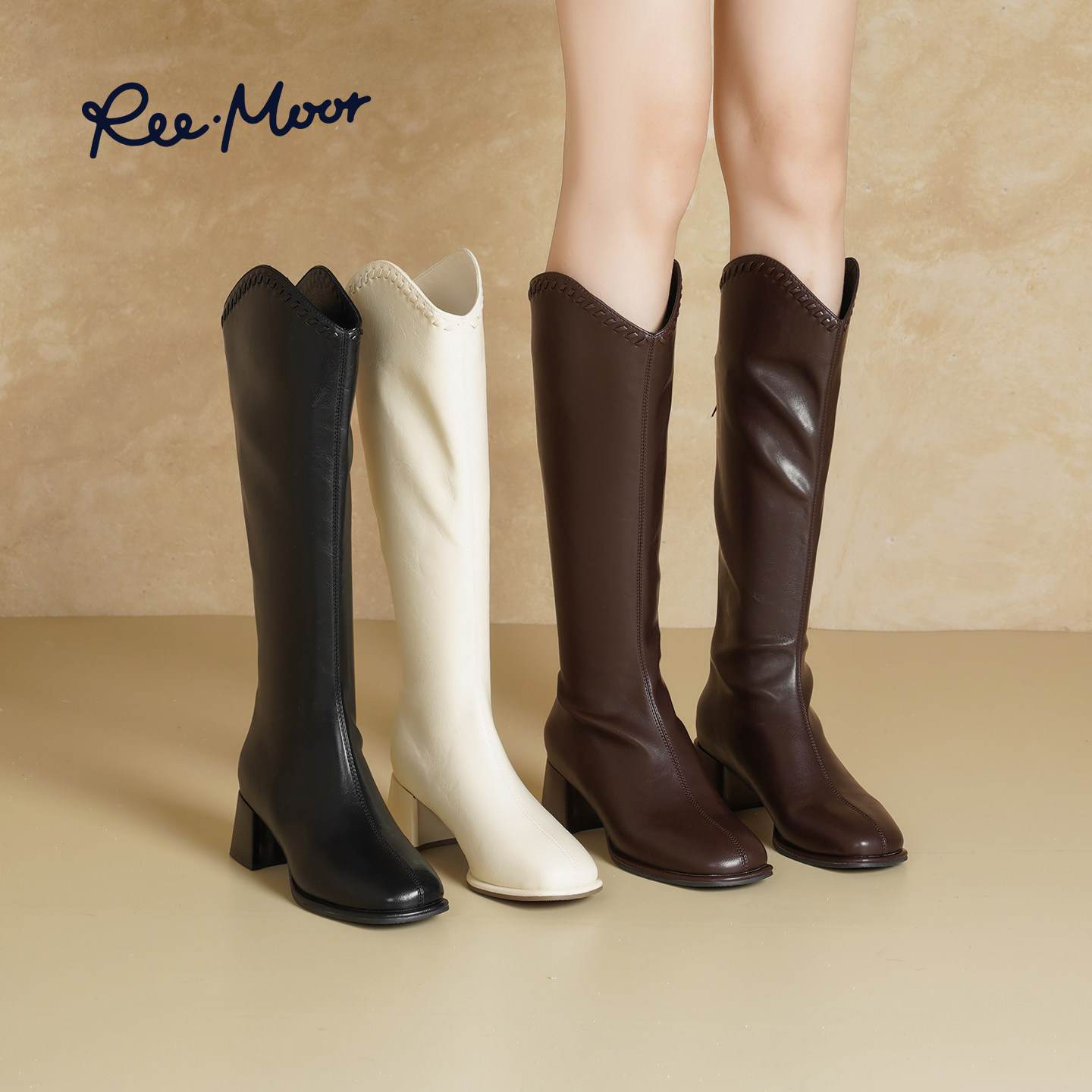 REEMOOR睿慕2025冬季新款英伦风真皮长筒骑士靴女粗跟增高瘦瘦靴