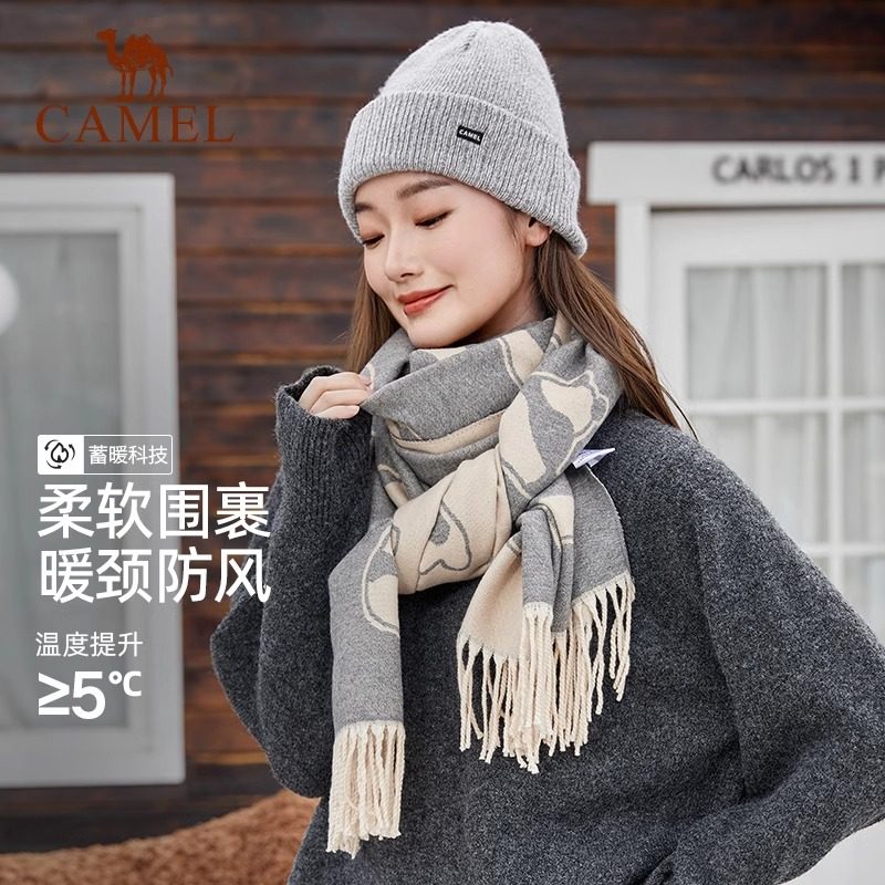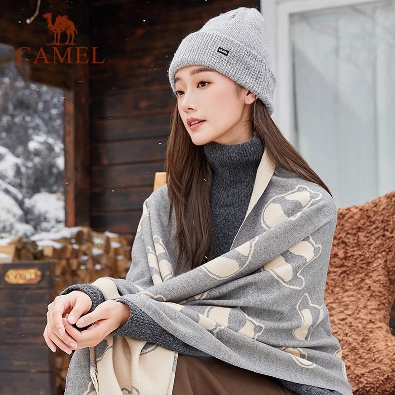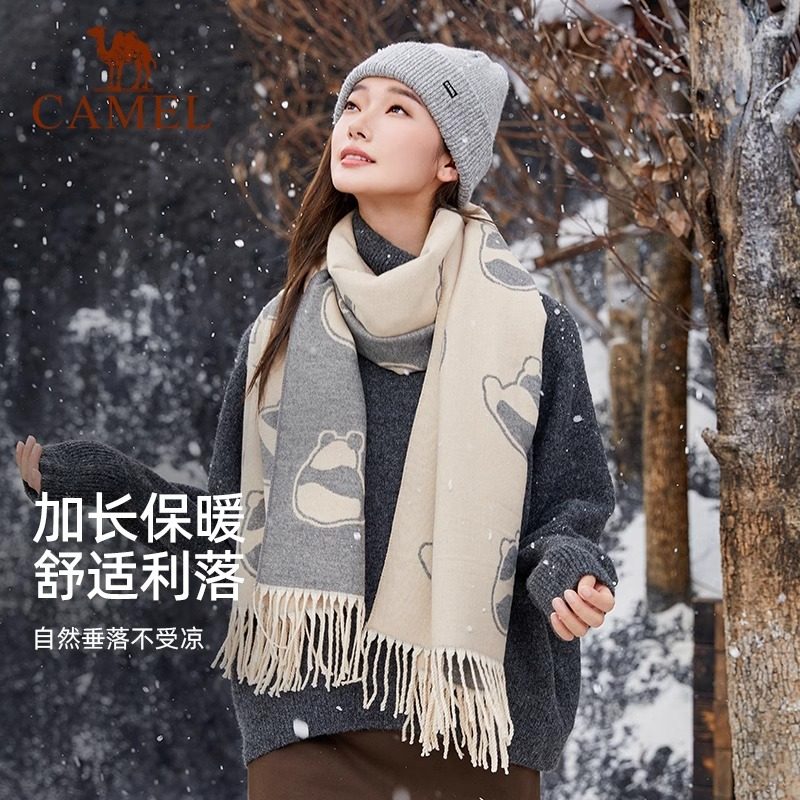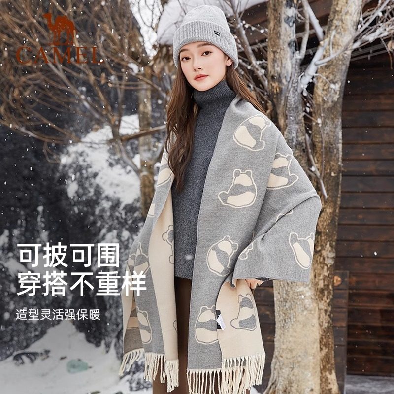 骆驼户外萌趣熊猫围巾2025秋冬简约百搭纯色防寒披肩围巾女