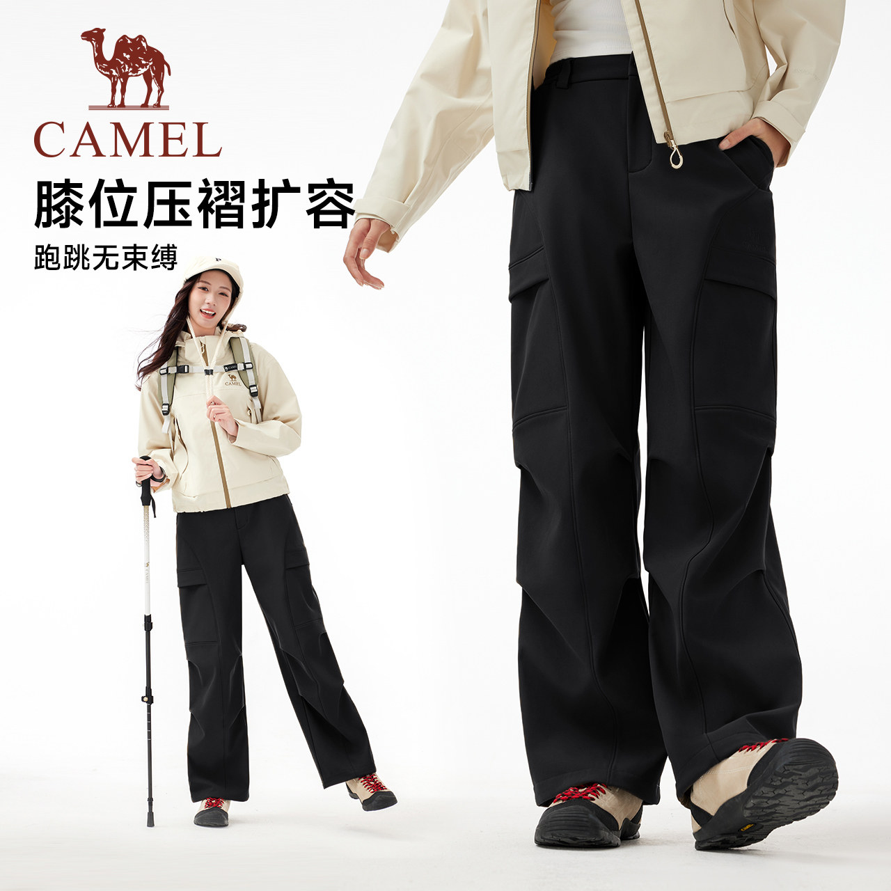 【防泼水】骆驼运动工装裤女冬季加绒休闲裤户外直筒徒步登山裤