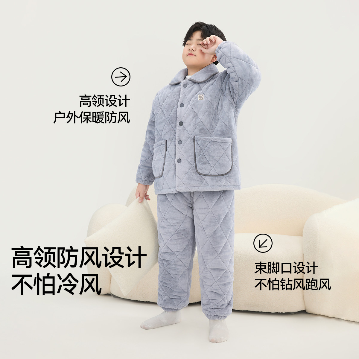 小黑托昵男女童连帽睡衣套装半边绒儿童家居服冬款加绒加厚空调服