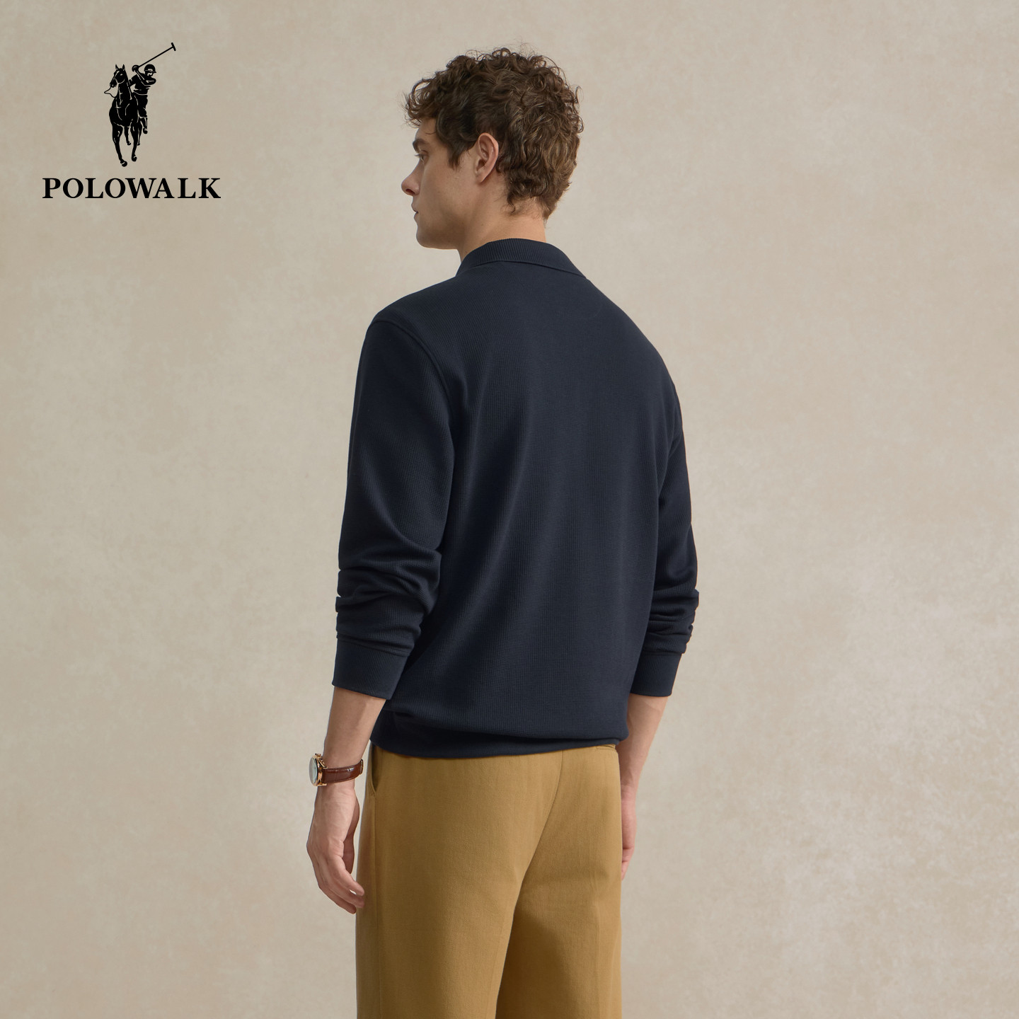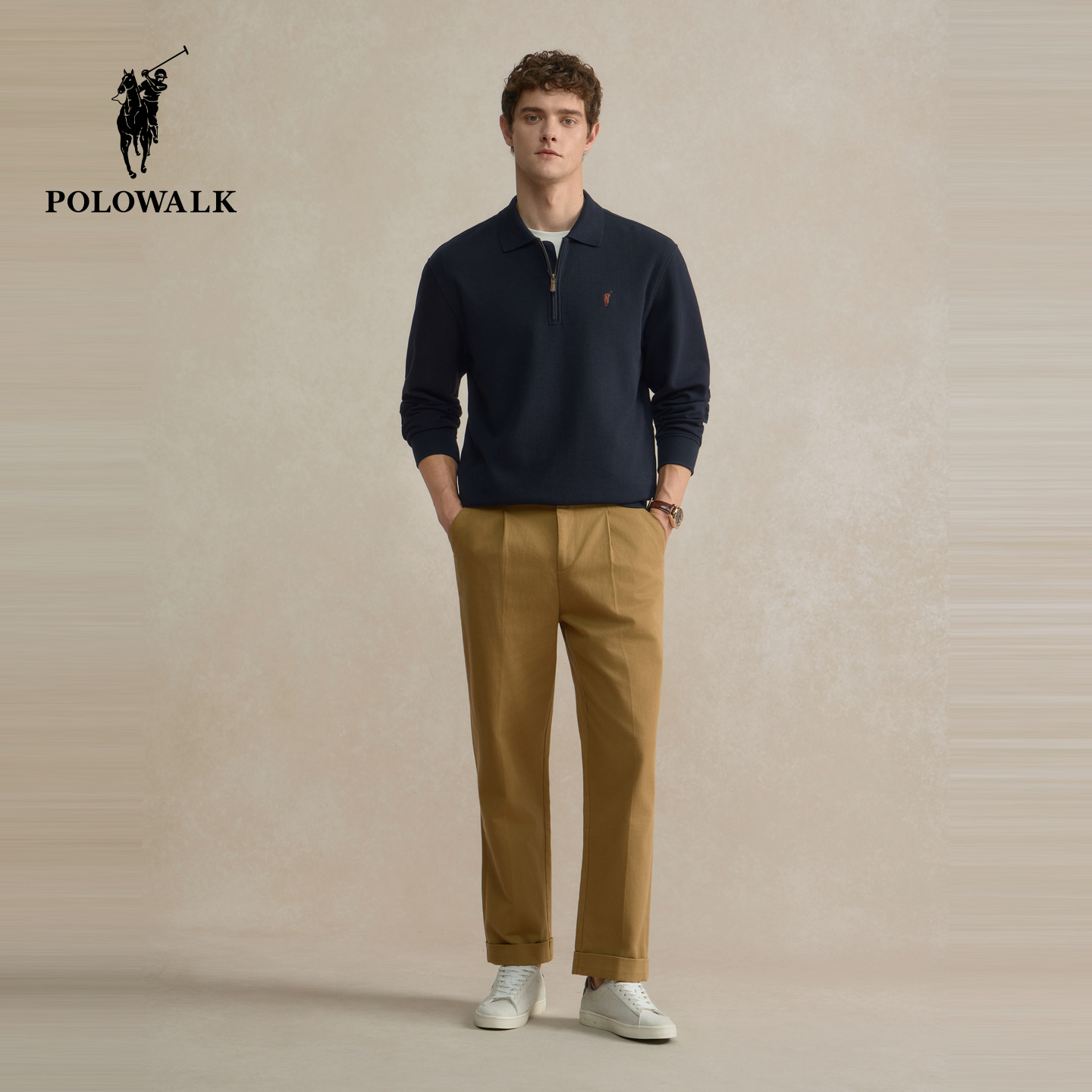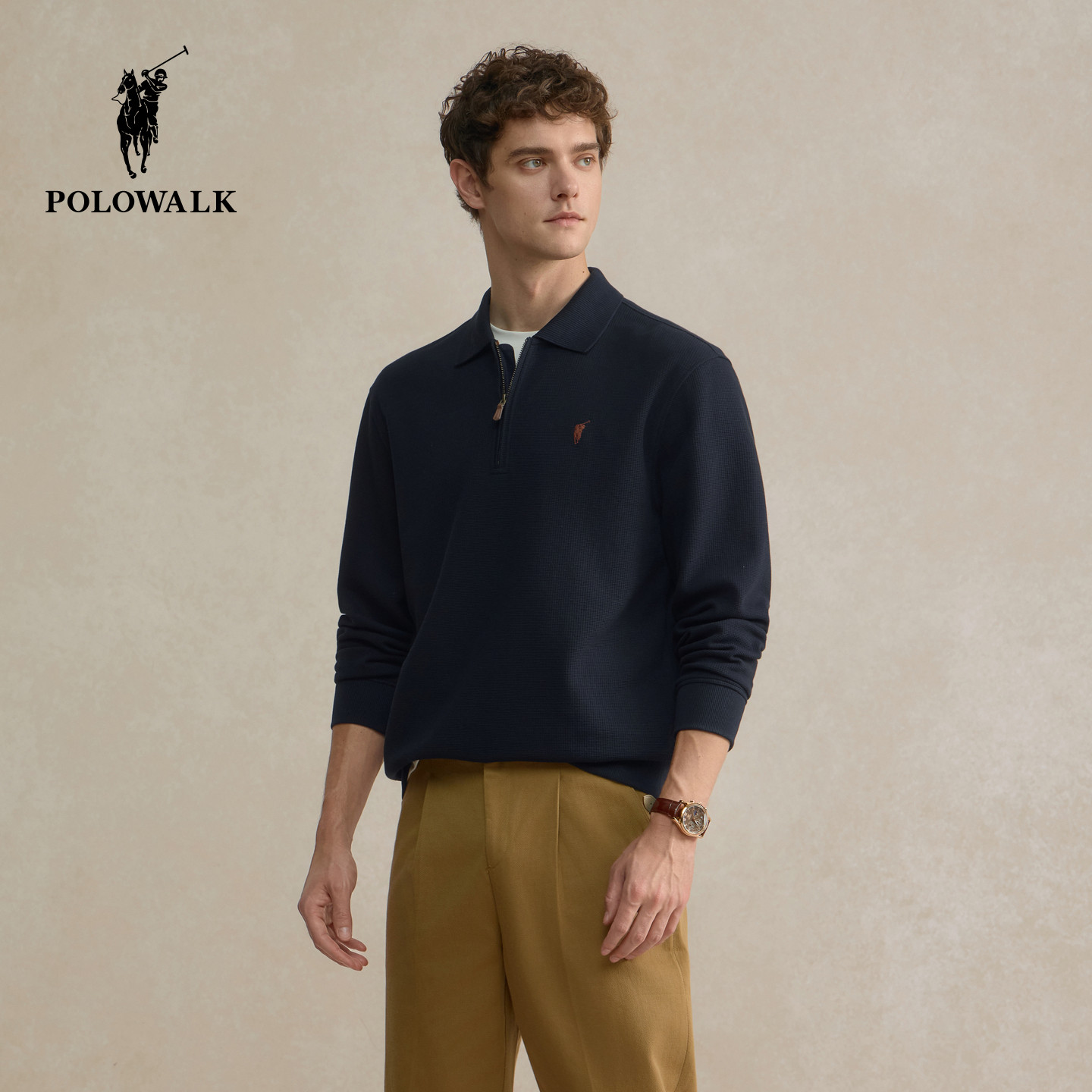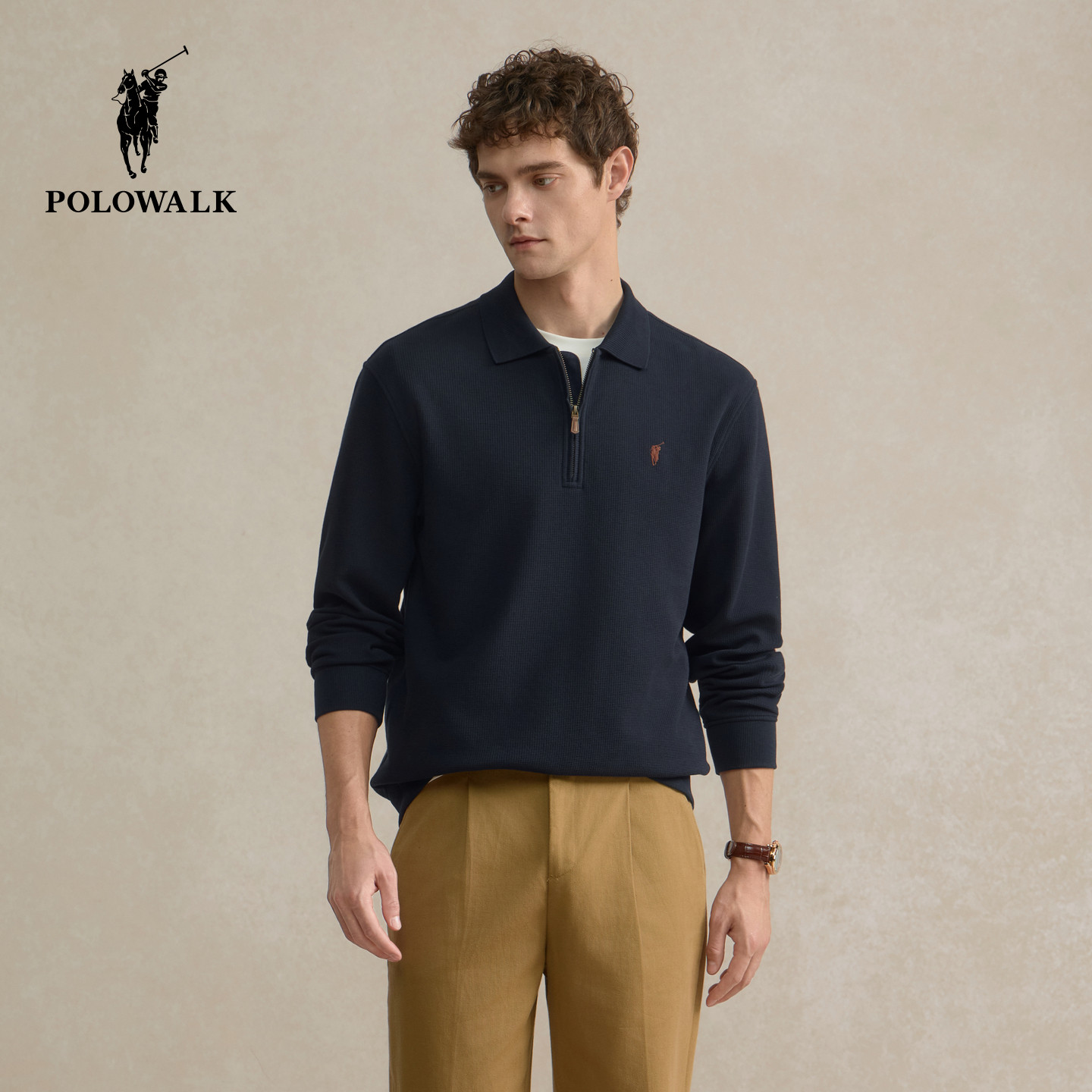 POLOWALK男装卫衣2025秋季新品华夫格半拉链休闲百搭翻领套头上衣