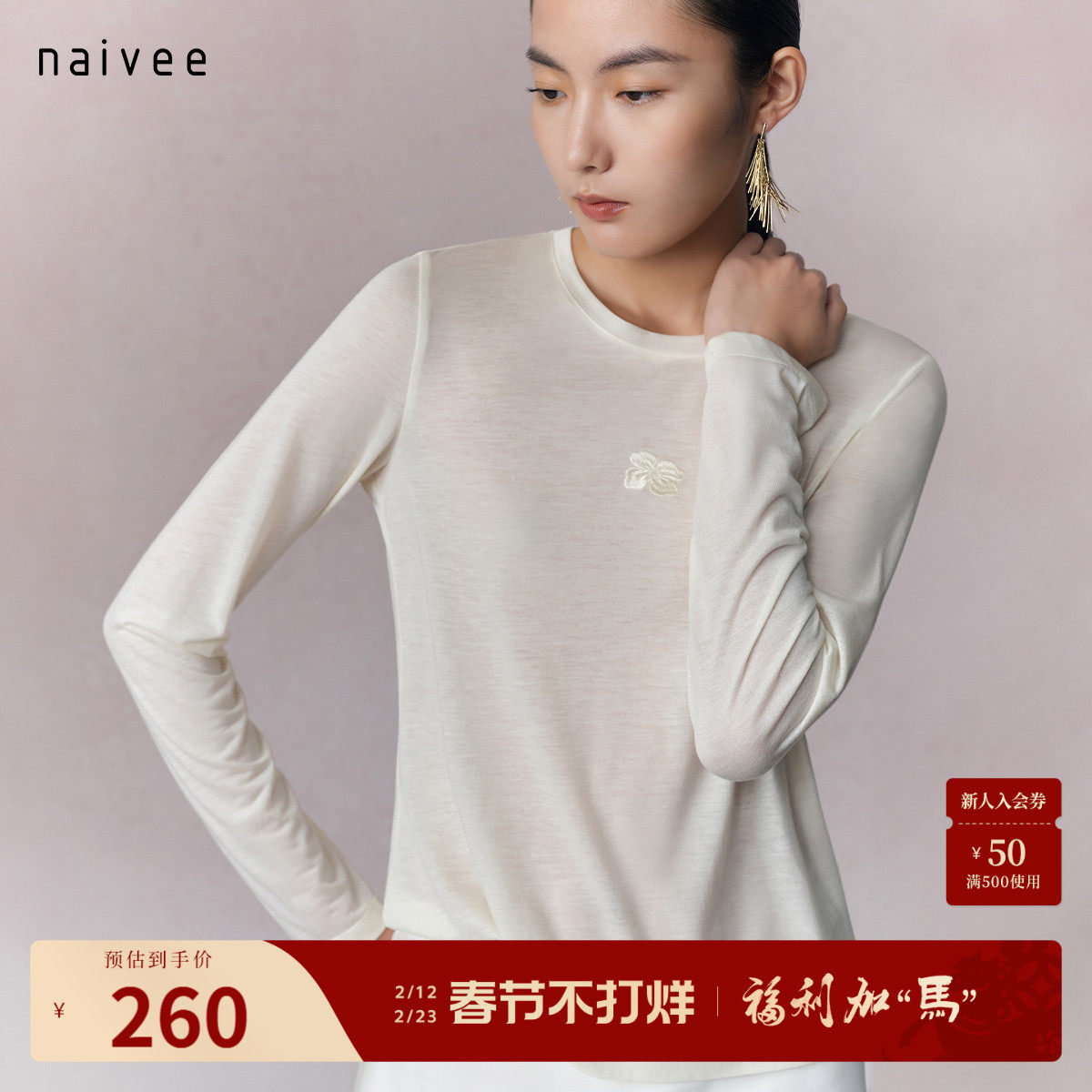 【抱花富】naivee纳薇25冬新兰精天丝羊毛15%圆领T恤针织打底衫