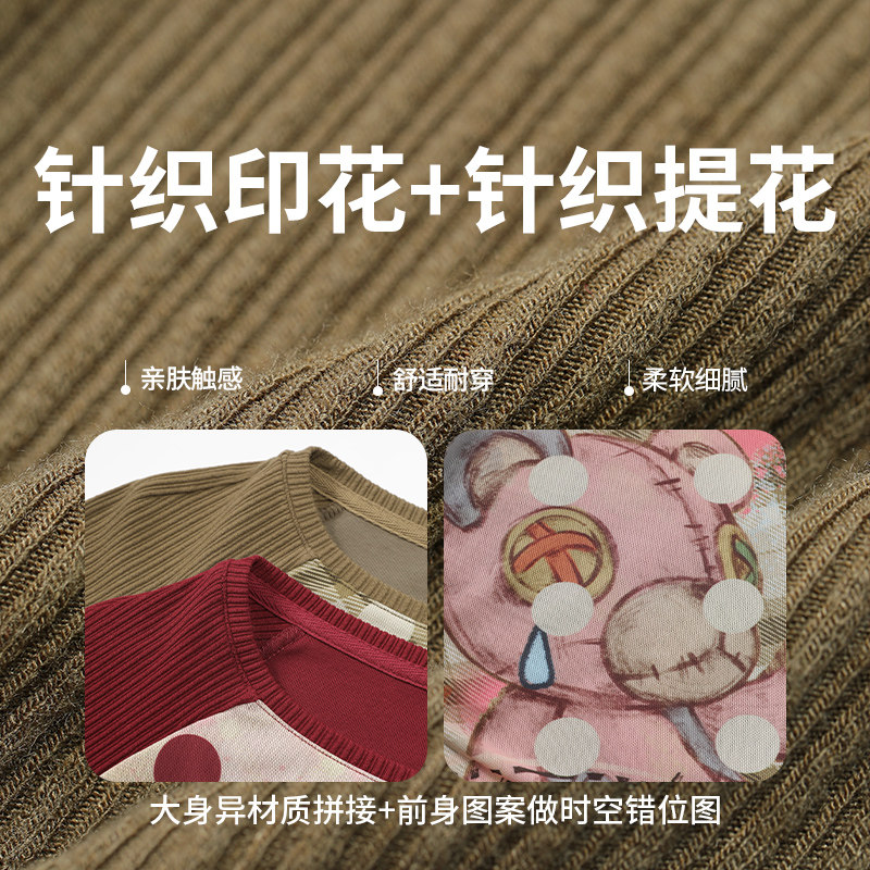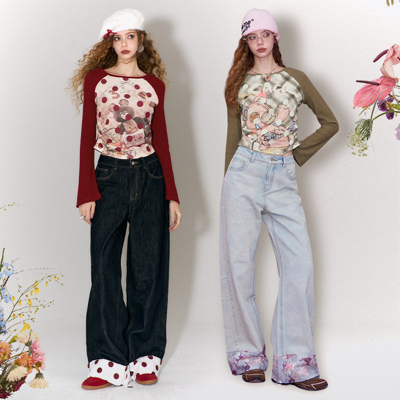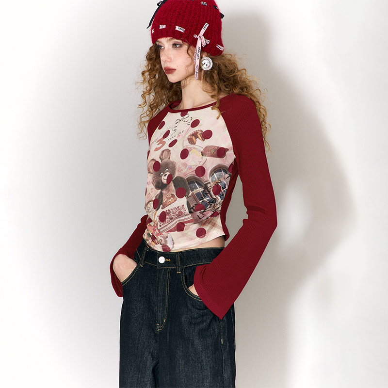 妖精的口袋红色插肩印花长袖t恤女2026早春新款修身内搭新年战袍