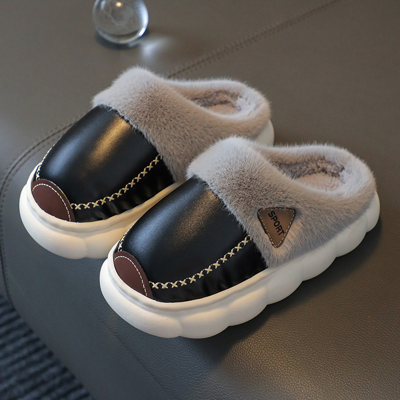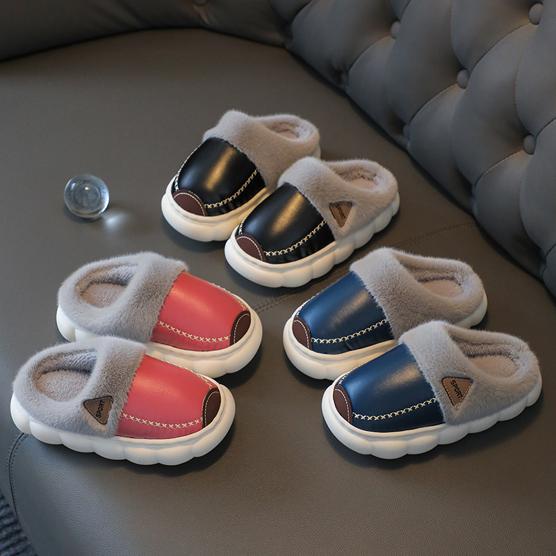 儿童拖鞋秋冬季男童皮面防水加绒加厚棉拖鞋软底女童亲子棉鞋室内