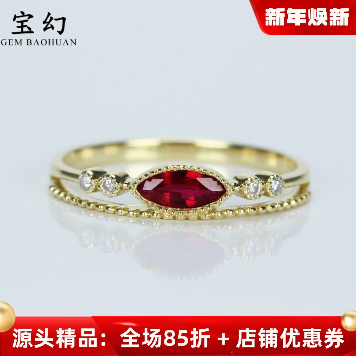 18K黄金天然鸽血红宝石橄榄马眼形戒指 包镶钻石复古清新女款指环