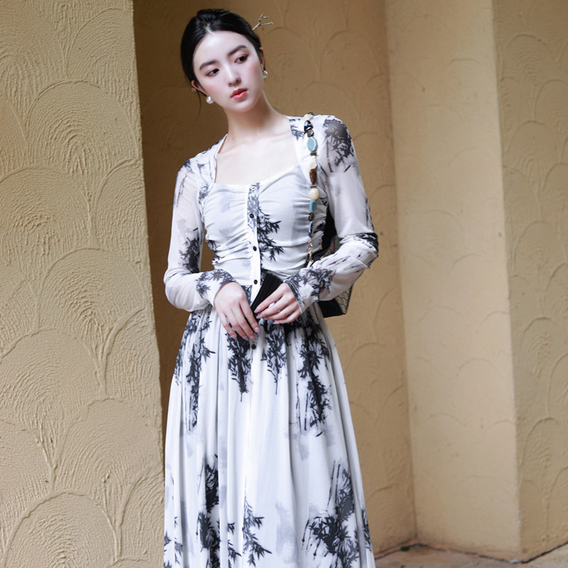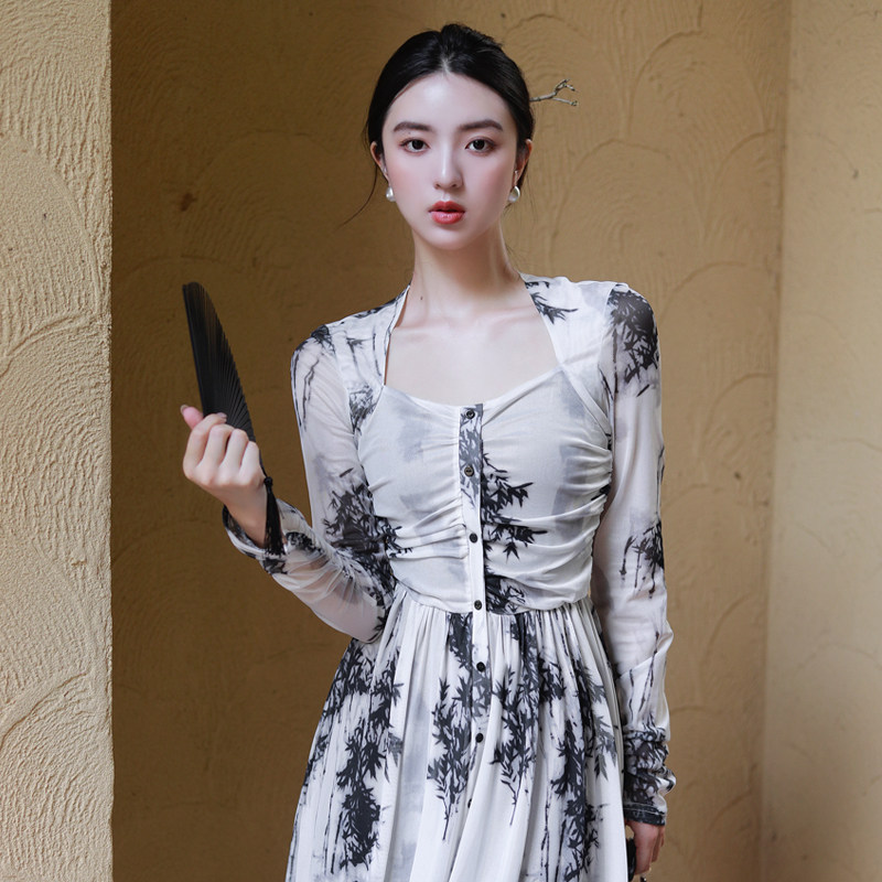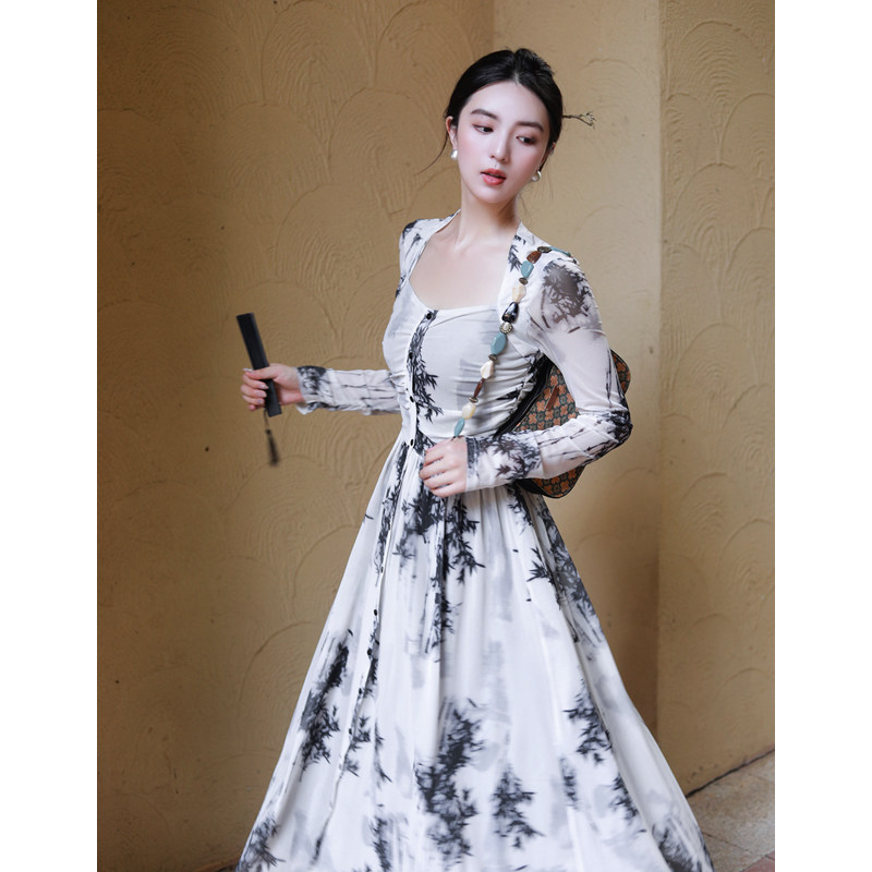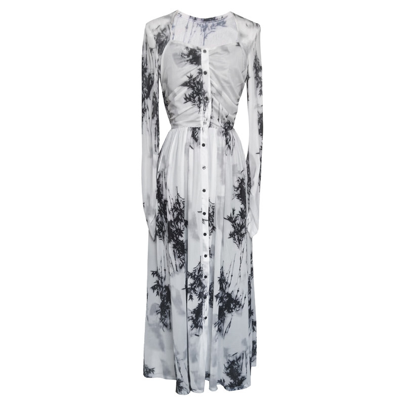 juju定制秋装新款印花连衣裙长袖法式复古修身显瘦水墨中长裙女