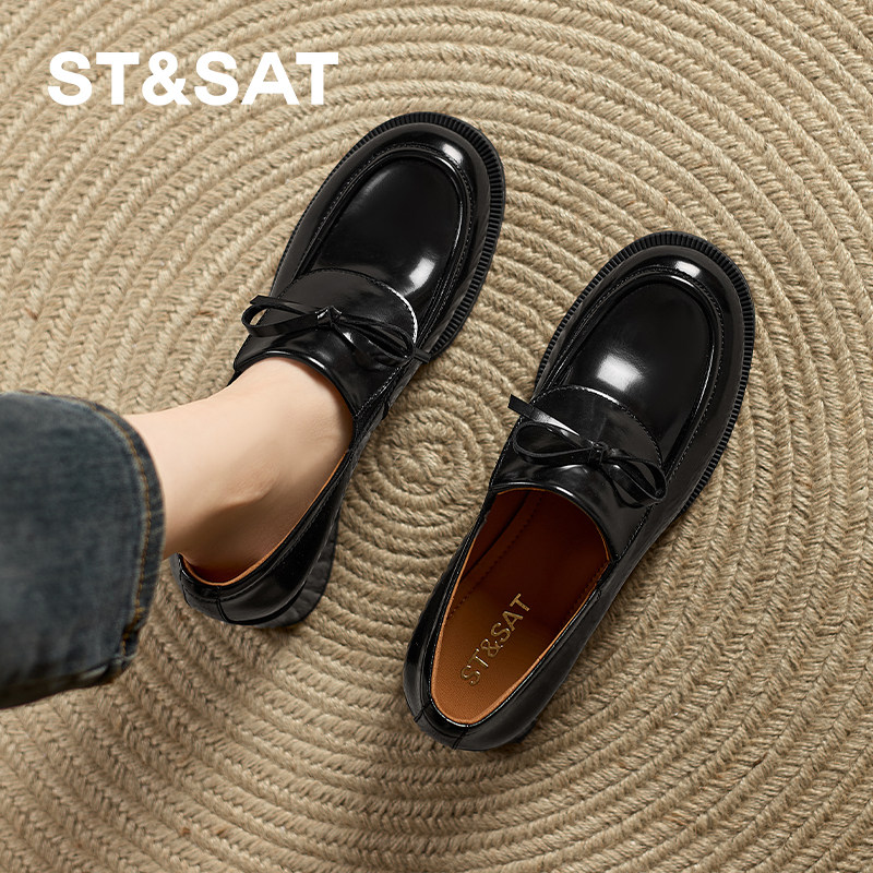 星期六真皮乐福鞋女山茶花新款秋季女鞋平底单鞋英伦风黑色小皮鞋