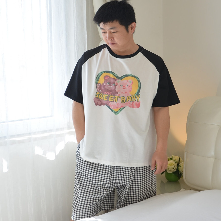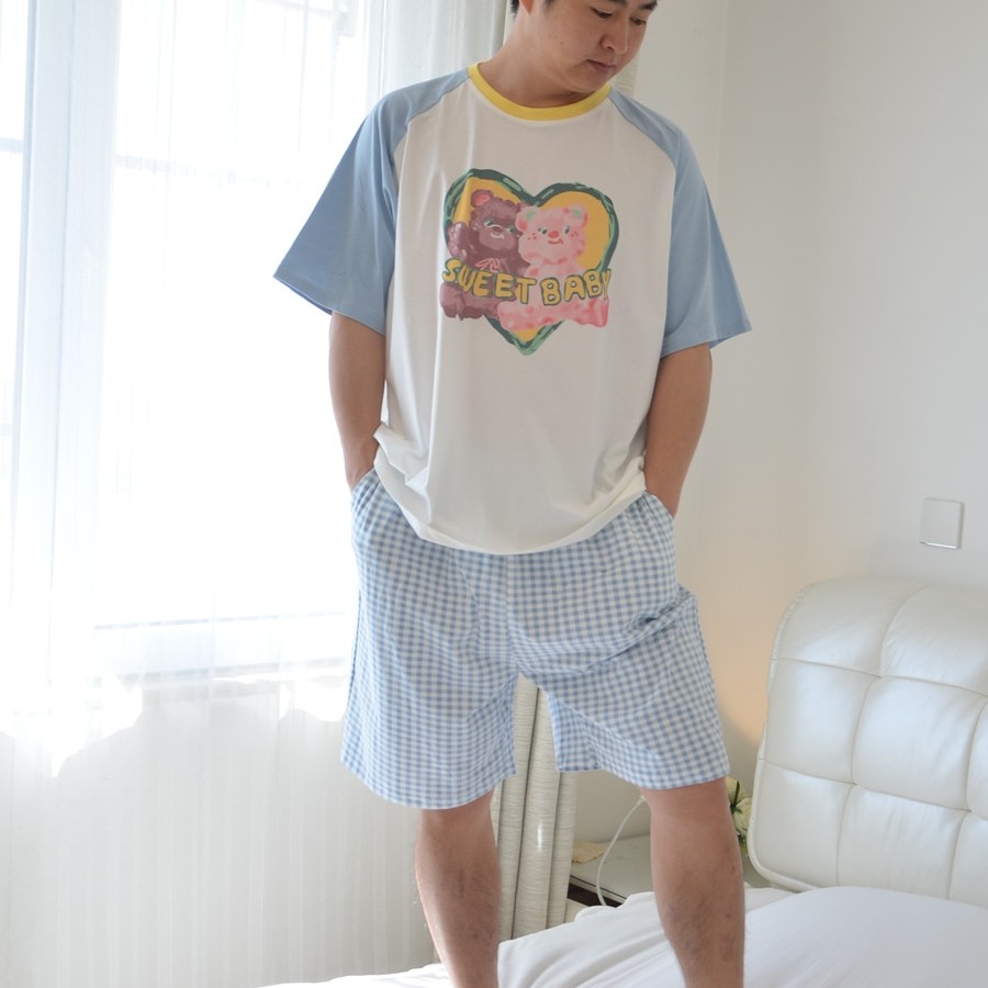 爱心熊睡衣加肥加大码夏季短袖短裤男女情侣针织纯棉休闲家居服