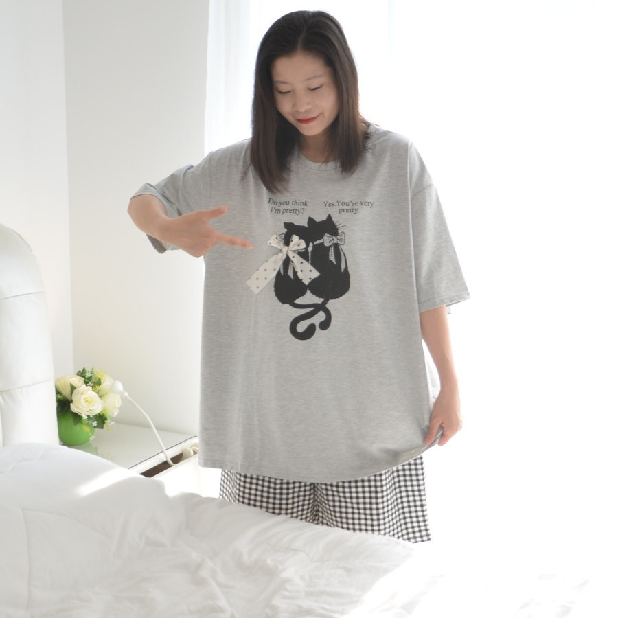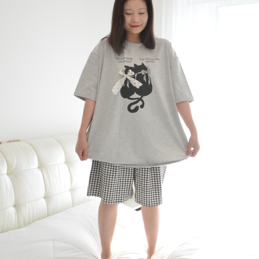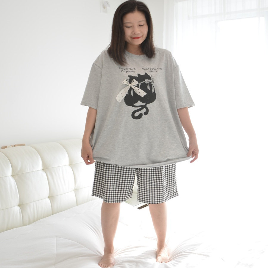 260斤加肥加大码卡通猫咪睡衣女胖MM夏季纯棉短袖短裤休闲家居服