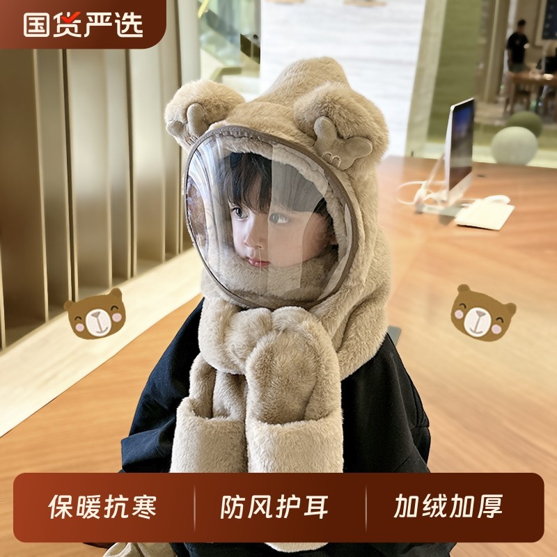宝宝帽子冬保暖毛绒帽男女童防护面罩儿童围巾手套一体帽防风护耳