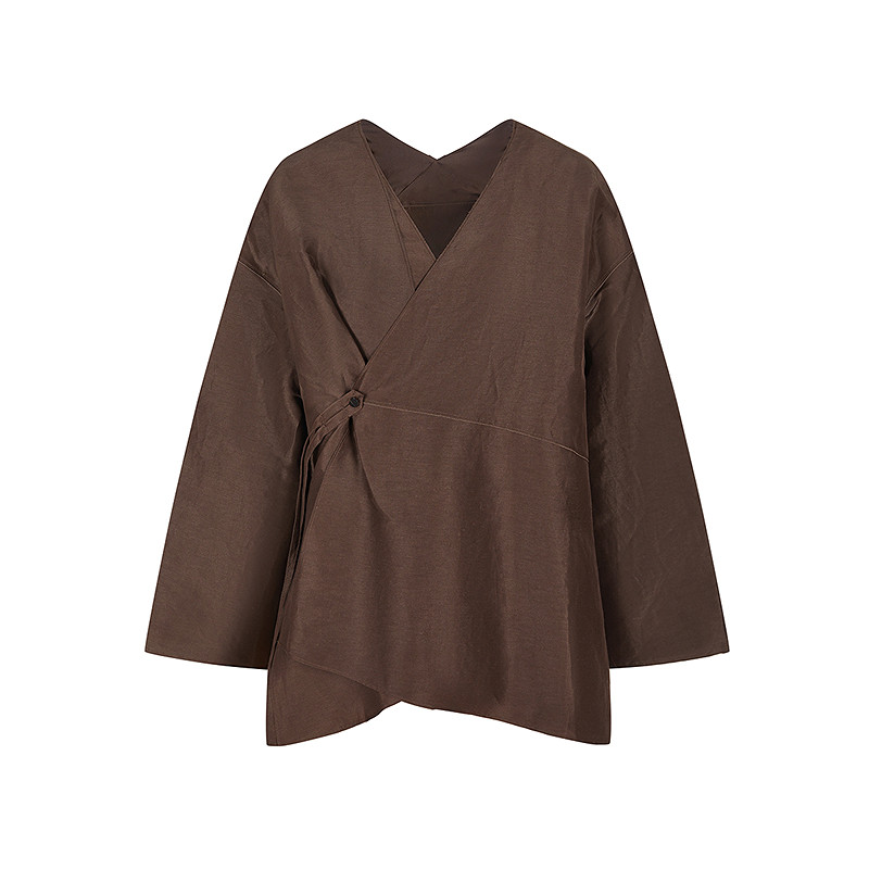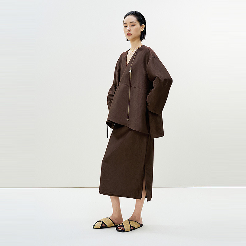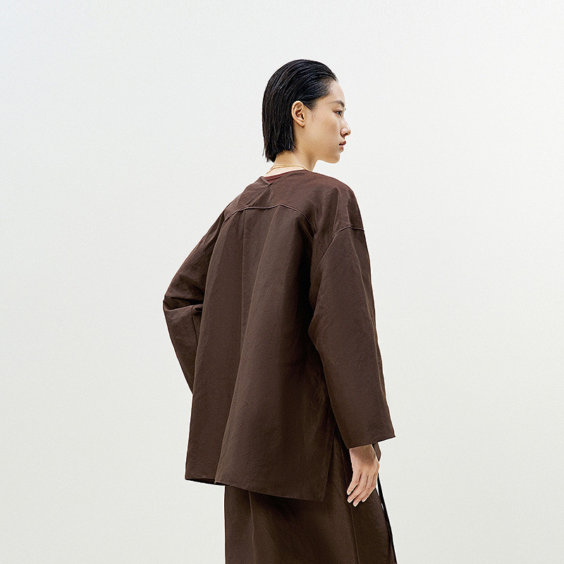LESS宽松无领外套女设计感新中式环保麻料休闲长袖上衣2P4613010