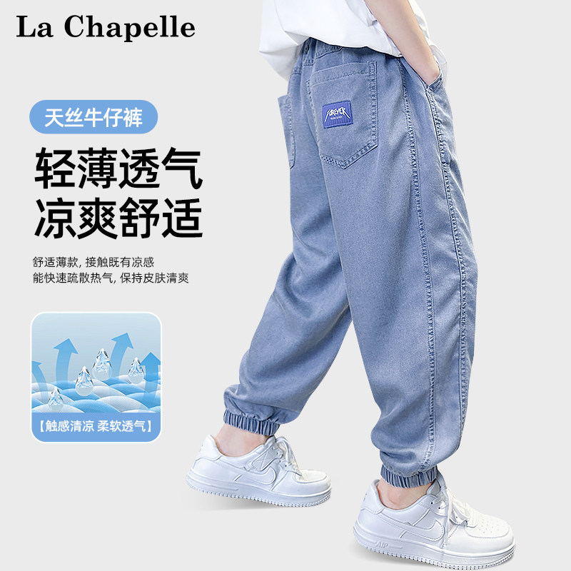 拉夏贝尔男童防蚊裤夏季2025新款儿童冰丝牛仔裤大童运动长裤夏装
