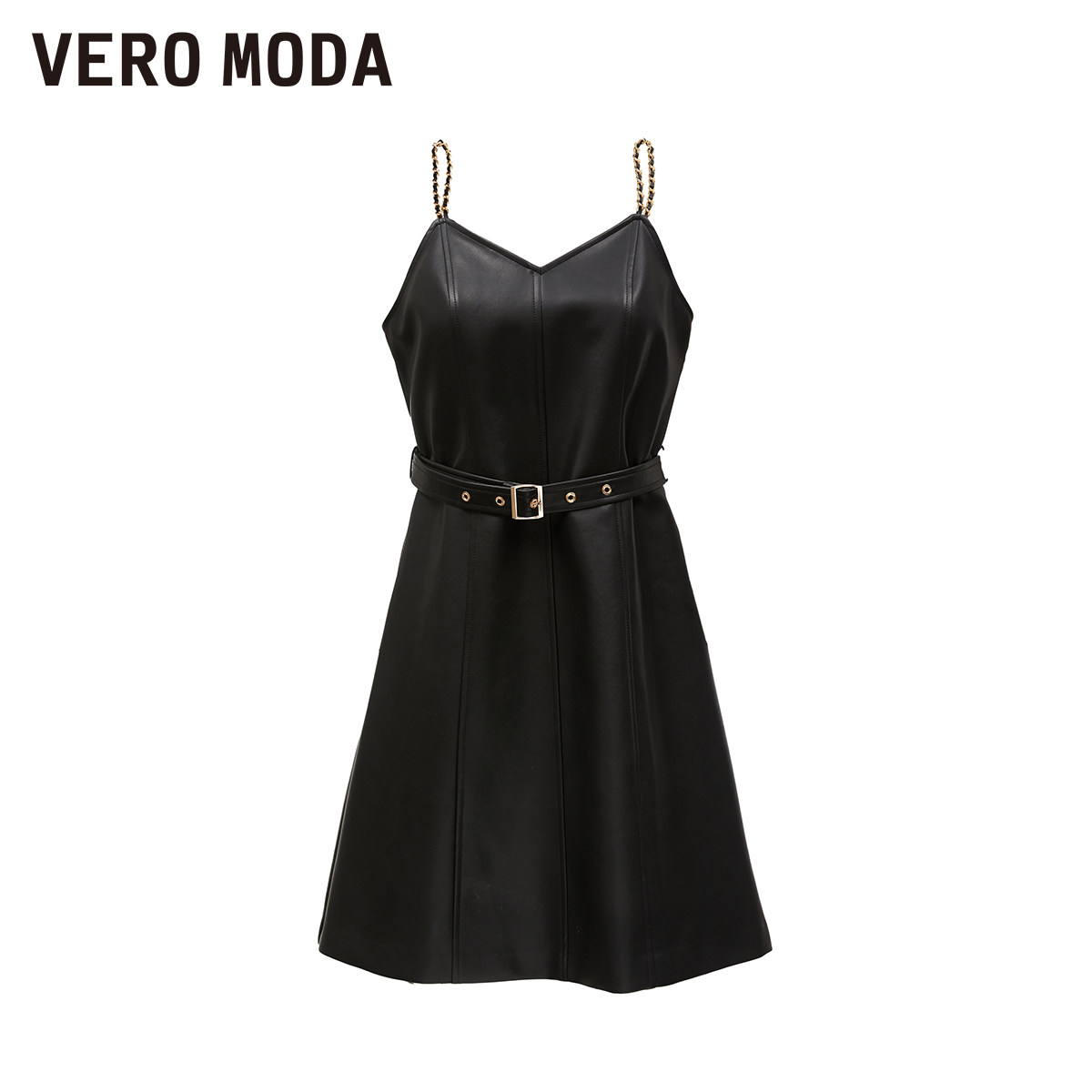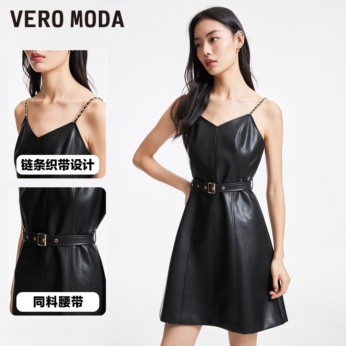 Vero Moda奥莱连衣裙秋季新款Pu显瘦收腰V领时髦链条吊带裙子无袖