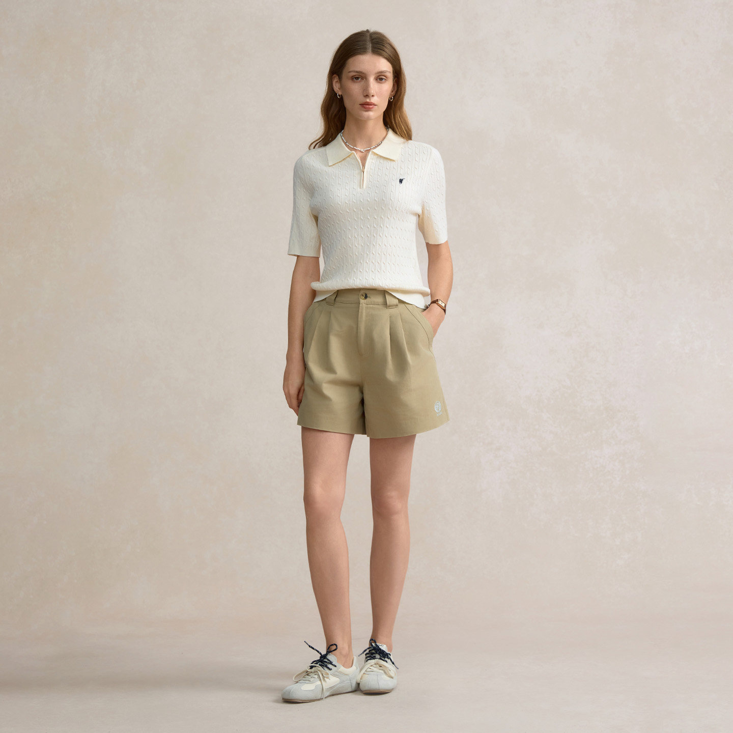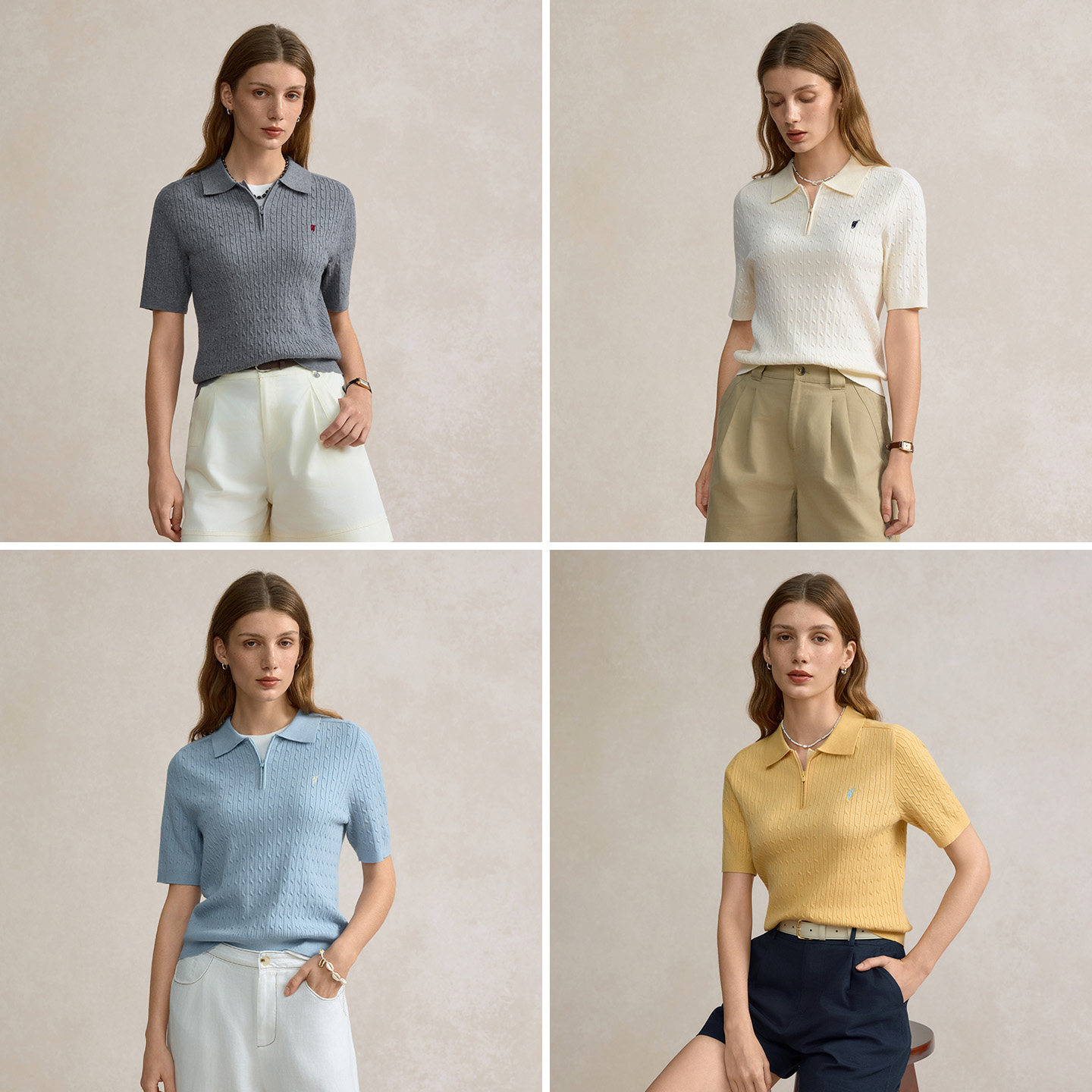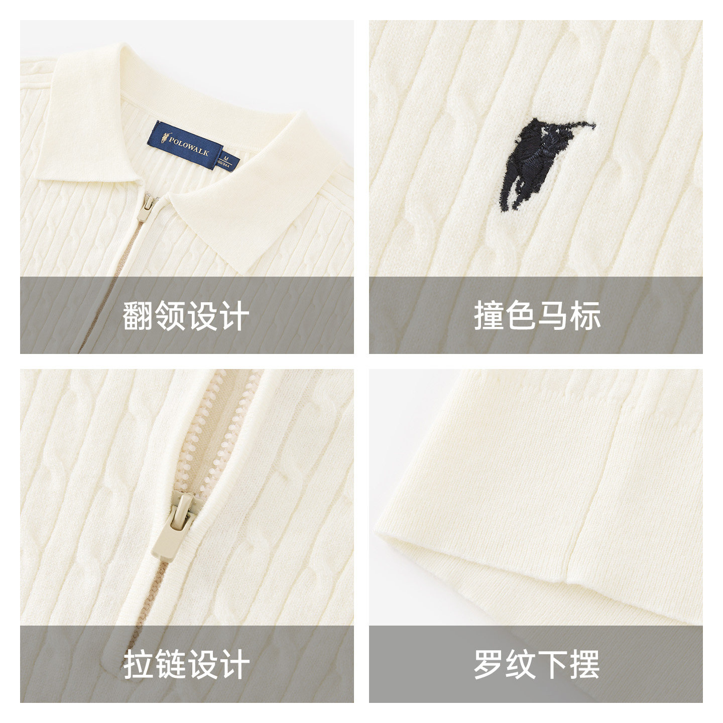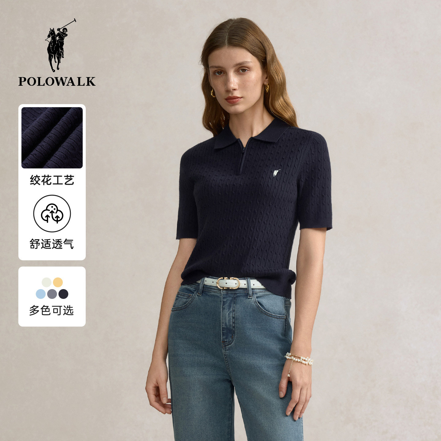 POLOWALK女式短袖针织衫2025秋季新品绞花翻领韩版修身半拉链T恤