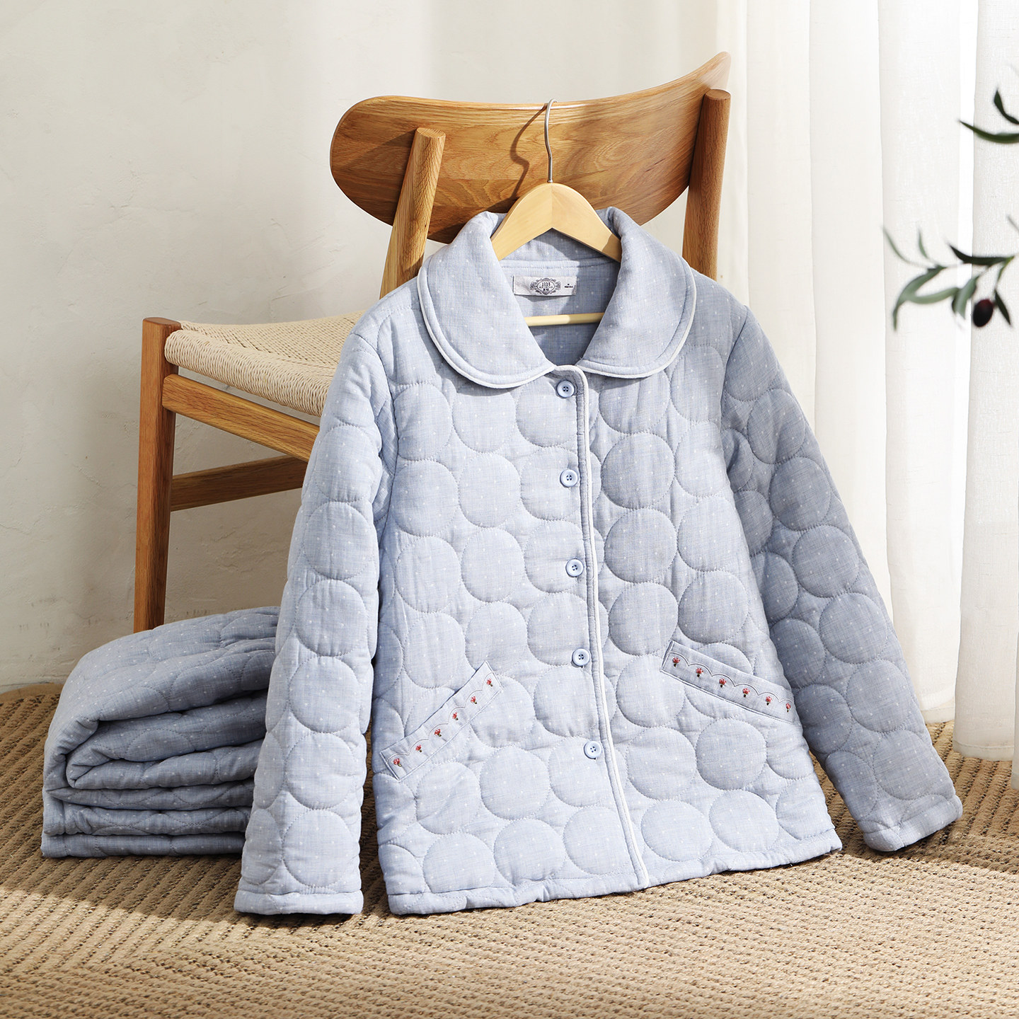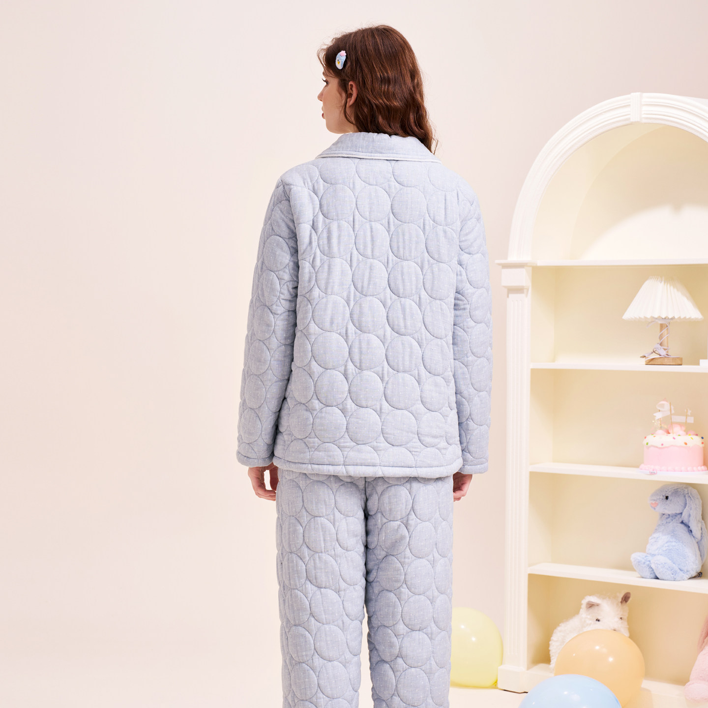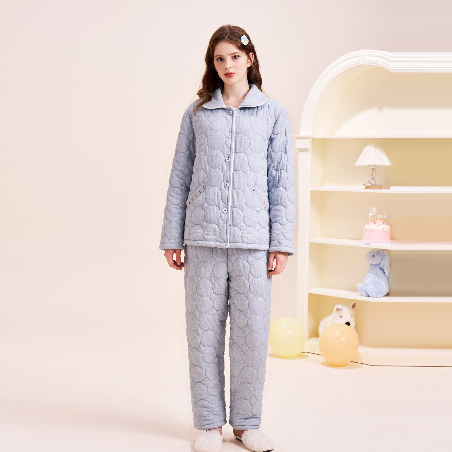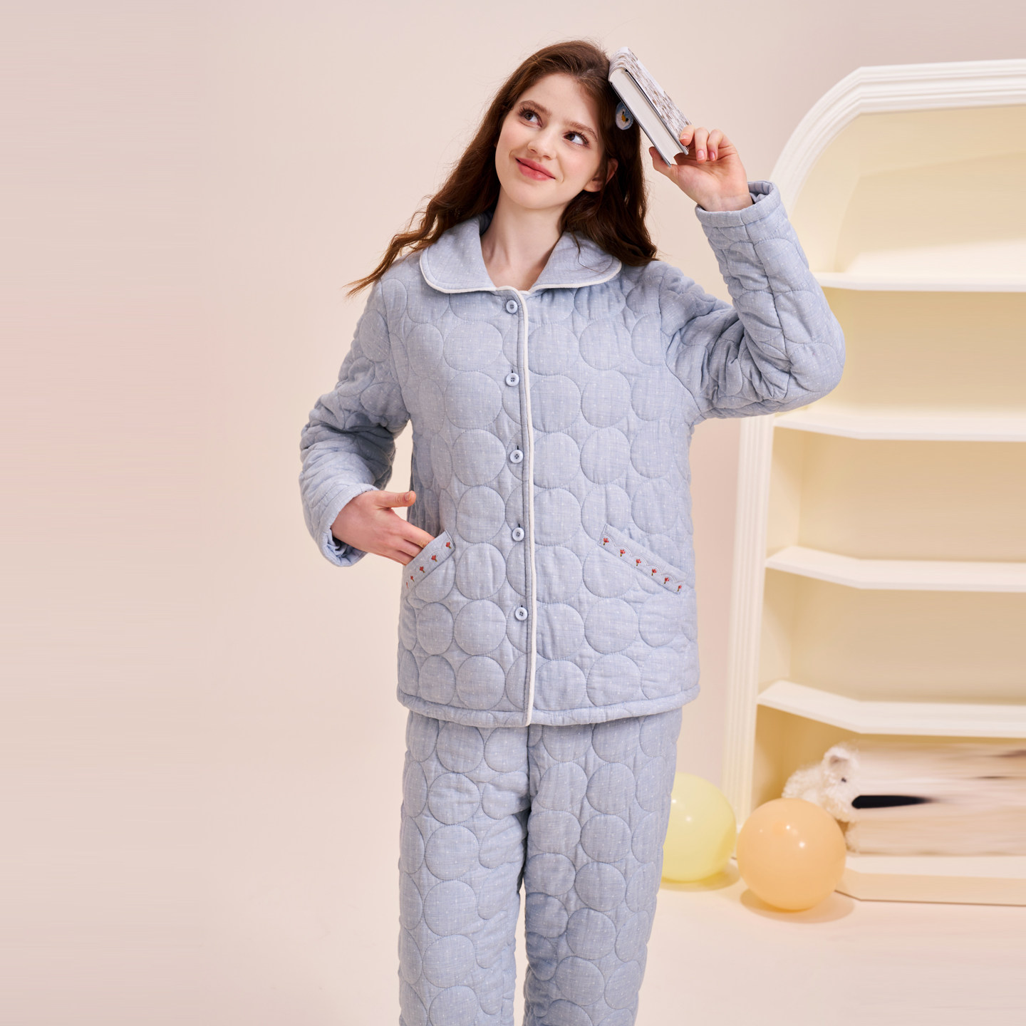 美标秋冬新款三层加厚夹棉纯棉睡衣套装女咖啡碳保暖全棉质家居服
