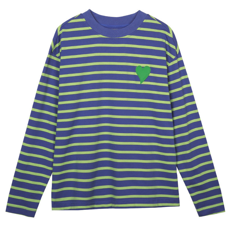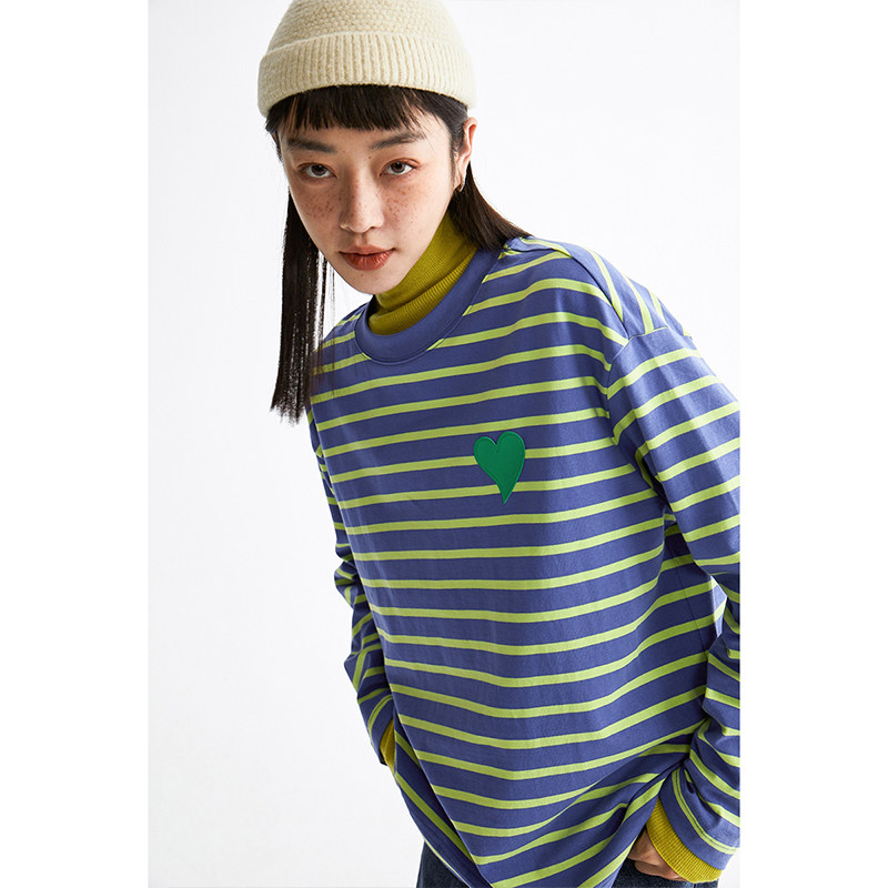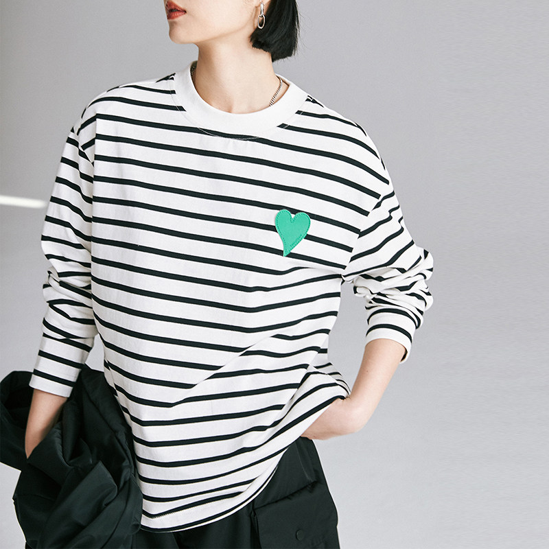 CLOUDSPACE女装条纹纯棉长袖爱心T恤春秋款两色可选小圆领上衣