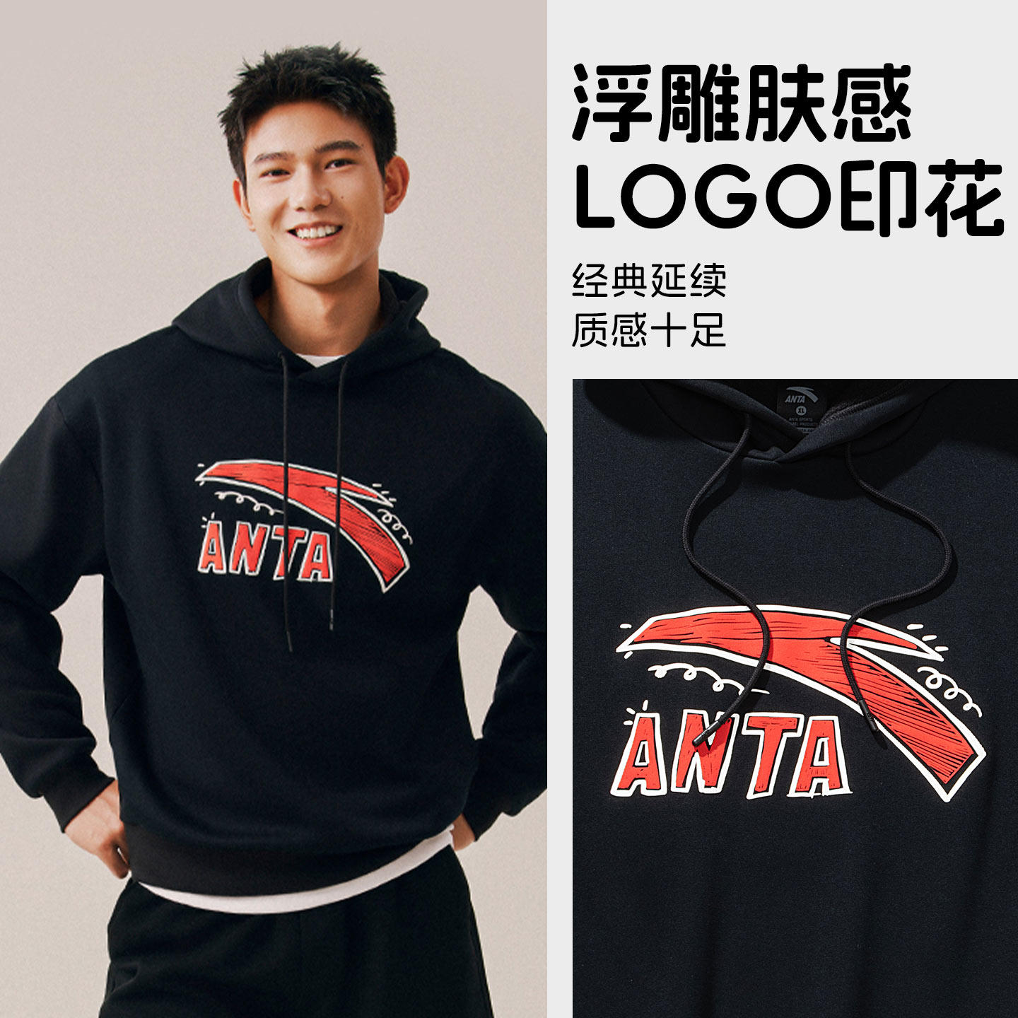 安踏休闲针织卫衣男女同款冬季新款黑色圆领加绒长袖情侣运动上衣