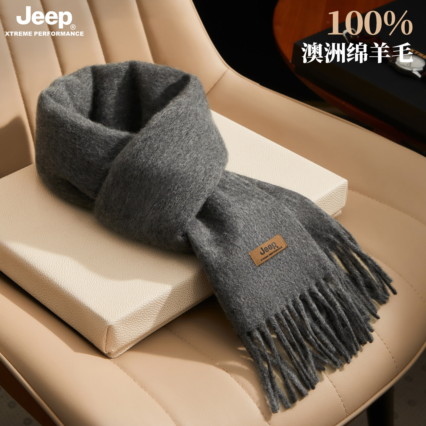 jeep吉普100%绵羊毛围巾男士商务冬季保暖围脖礼盒装送男友礼物冬