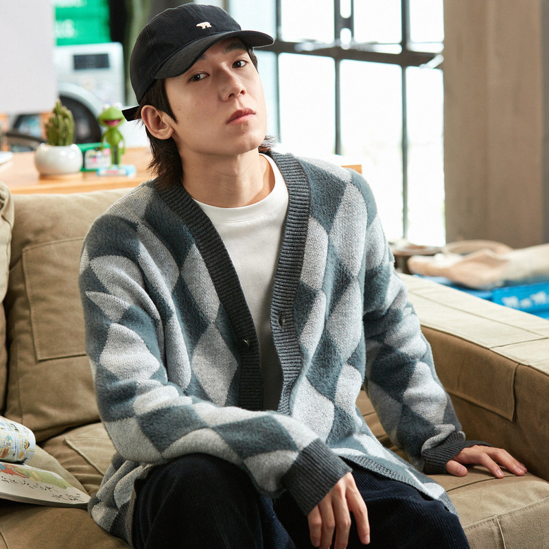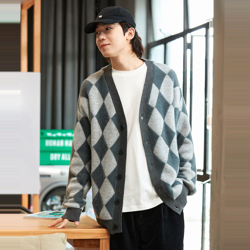 唐狮男士毛衣开衫秋冬季新宽松外套v领几何菱形格男毛衫潮