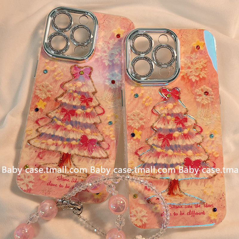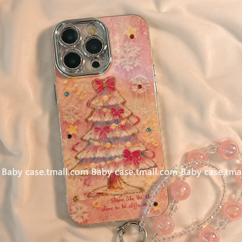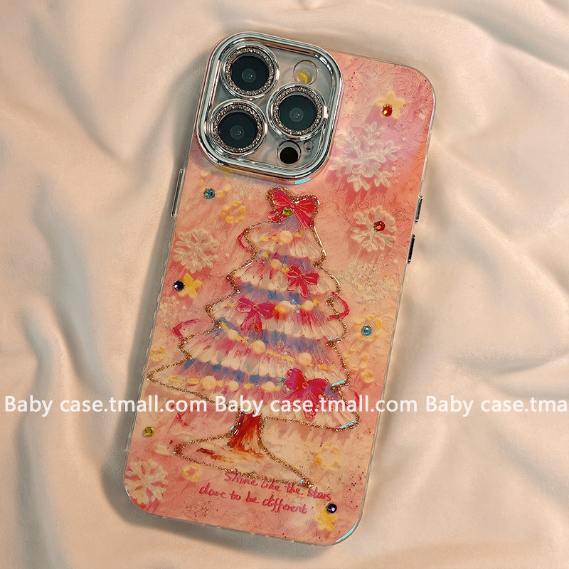 ins梦幻油画蝴蝶结圣诞树适用苹果17promax手机壳iPhone15新款14pm蓝光13带链条16pro小众女15pm高级感12全包
