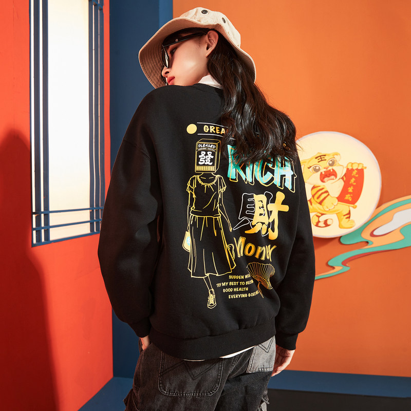 唐狮国潮卫衣女春秋装新款chic港风发财外套设计小众白色卫