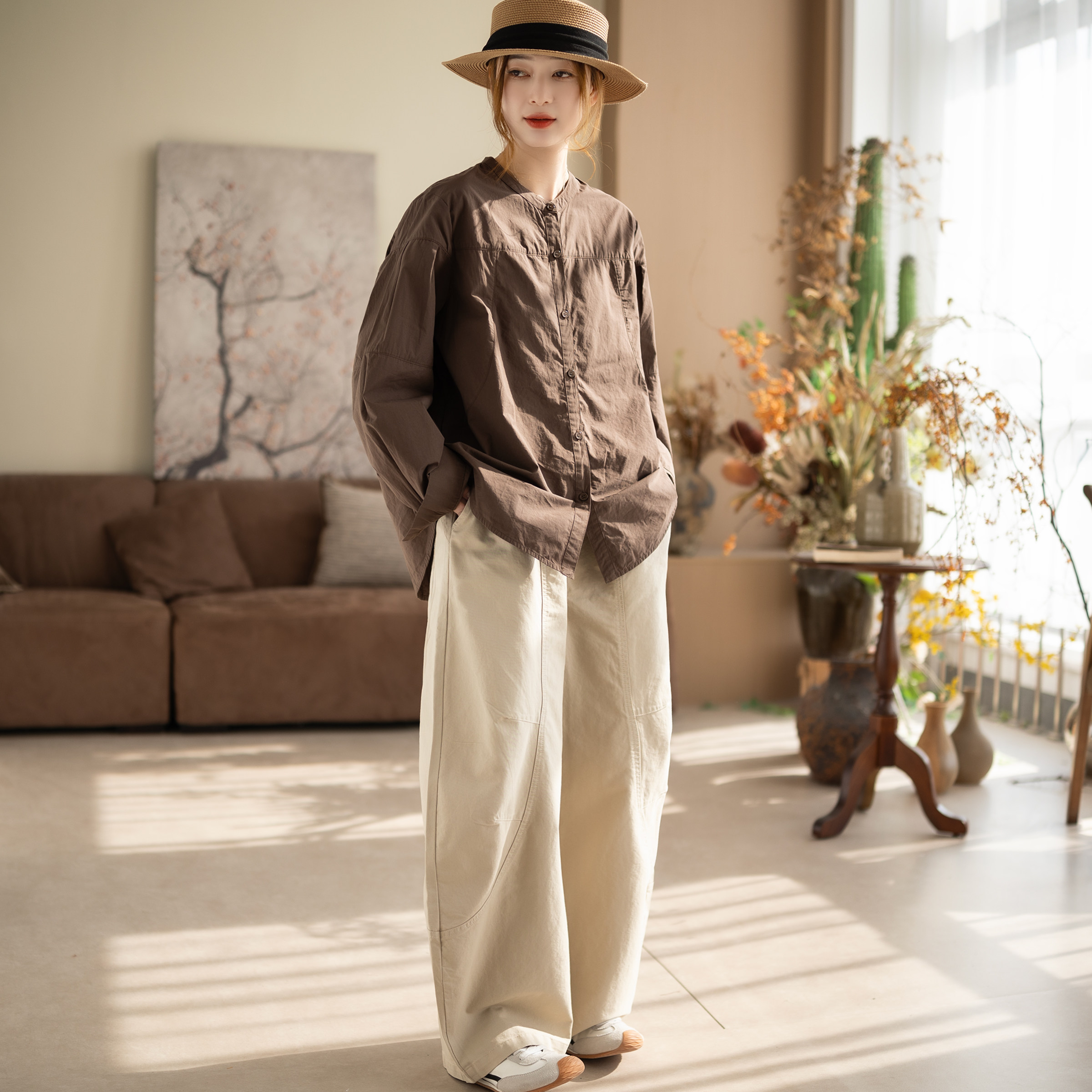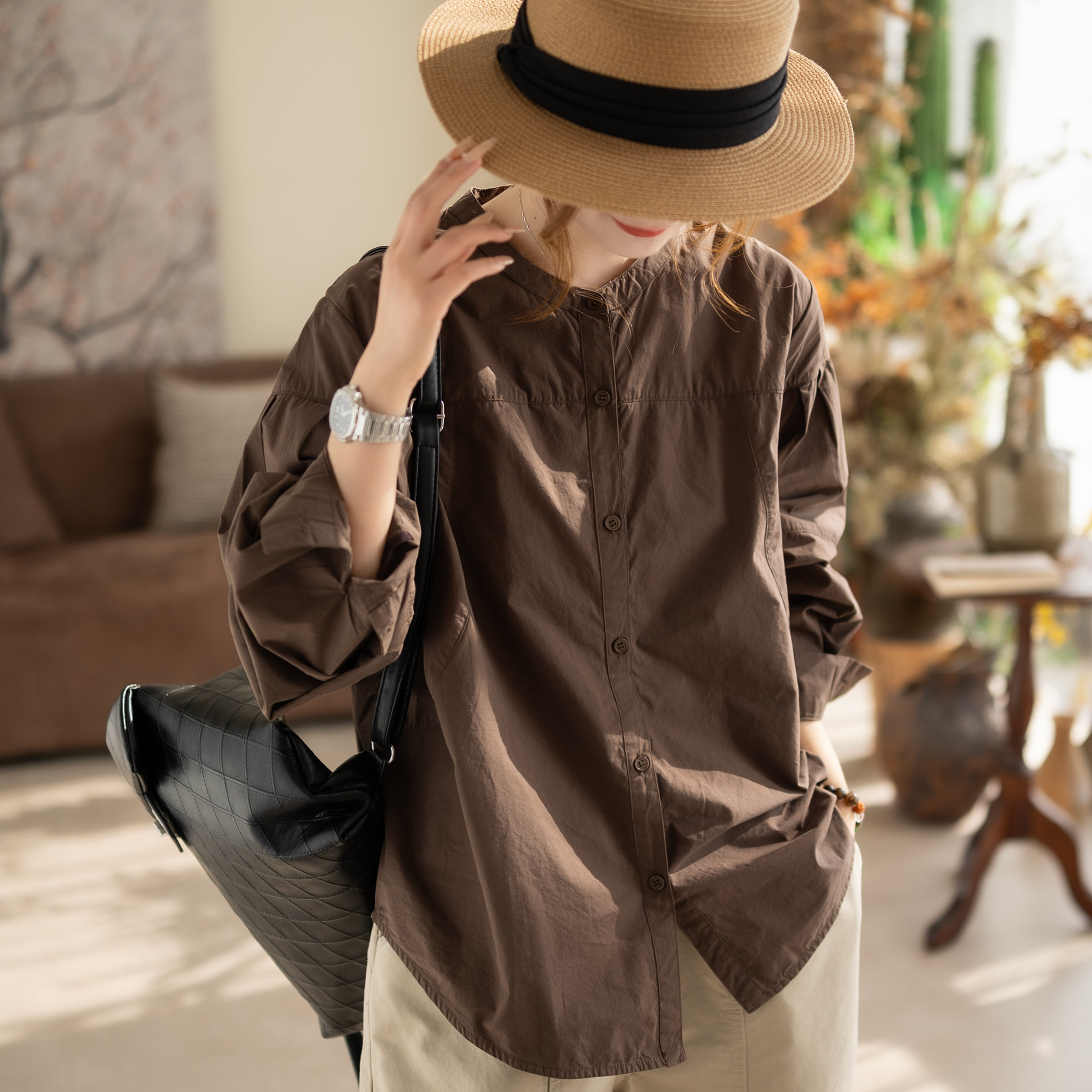 咖咪羽原创立领蓝色衬衫女春秋款日系复古长袖宽松版衬衫上衣