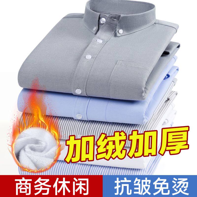 男士牛津纺长袖衬衫保暖舒适青年商务工作装加绒加厚休闲纯色衬衣