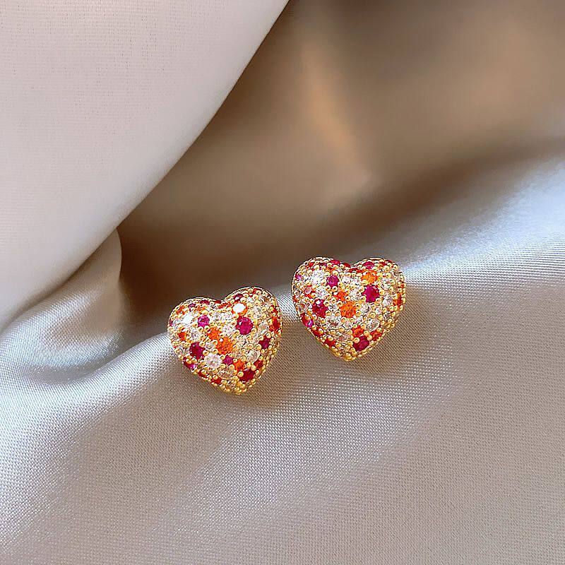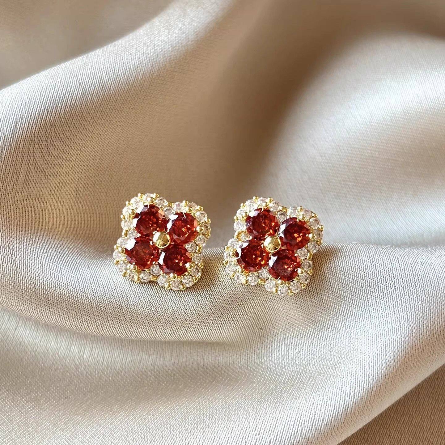银针红色耳钉精致时尚方形满钻耳环简约设计个性耳饰秋冬新款韩国