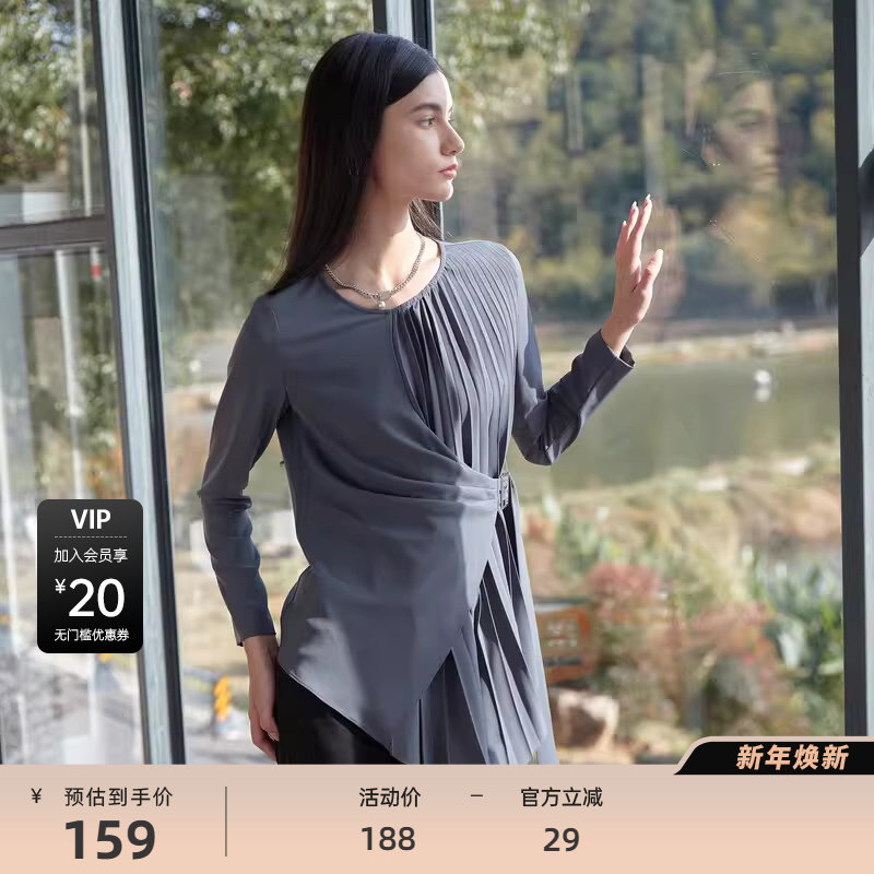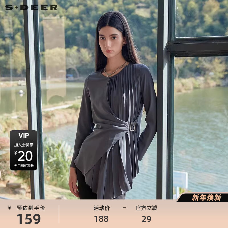 sdeer圣迪奥女装秋OL风圆领风琴褶收腰雪纺衬衫S24160509