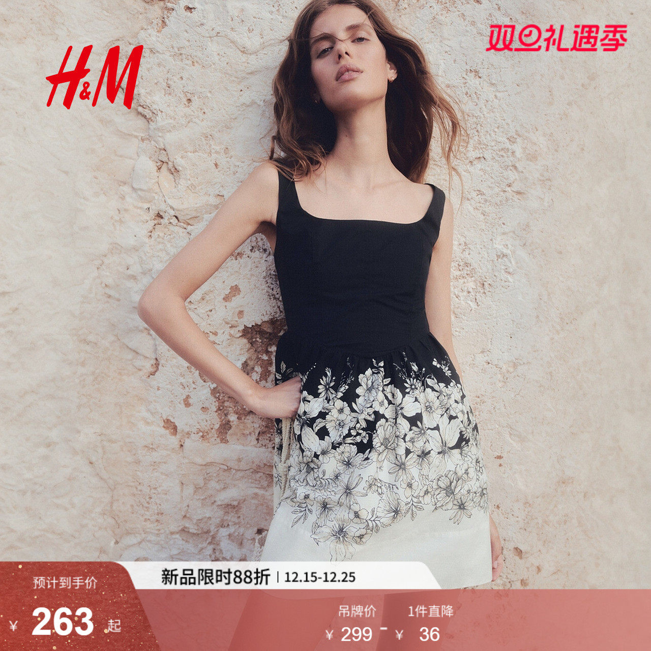 HM女装连衣裙2025冬季新款露背方领度假吊带设计感碎花裙1273504
