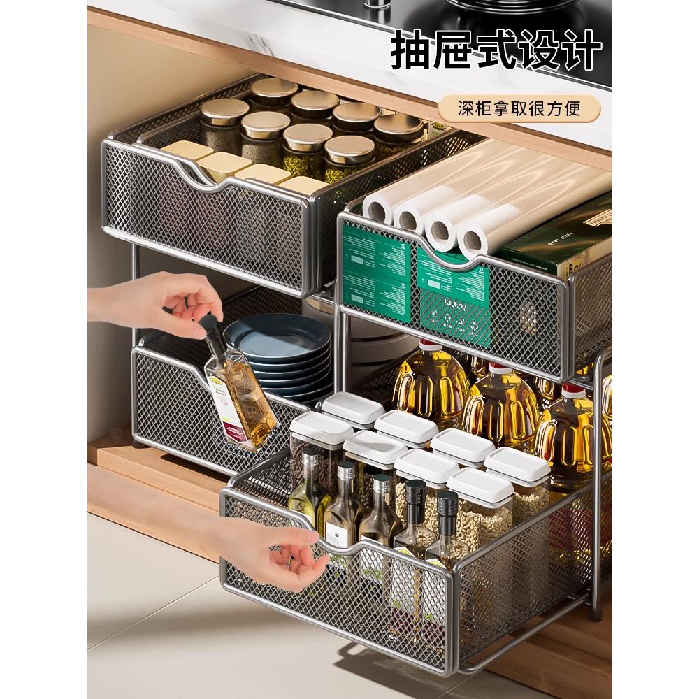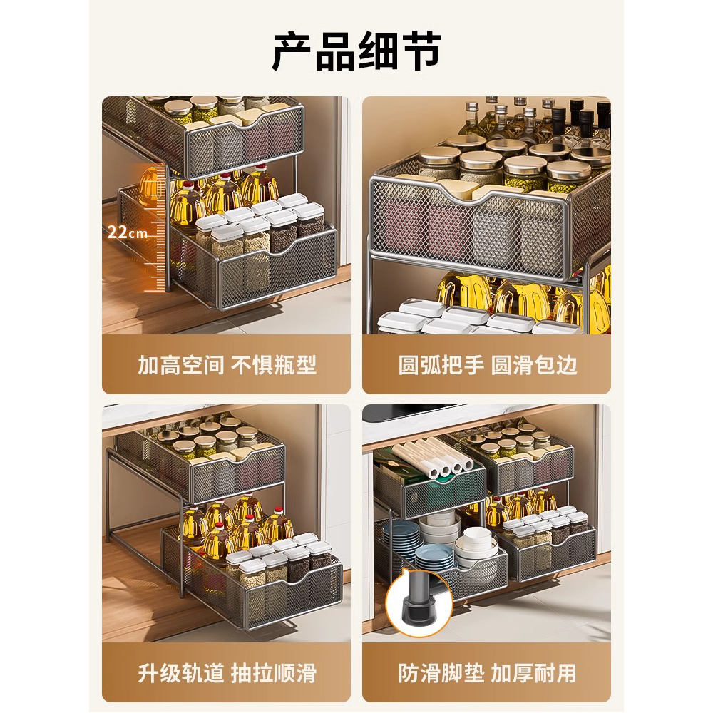 北欧风格厨房抽拉式分层置物架橱柜内下水槽双层收纳拉篮分层架