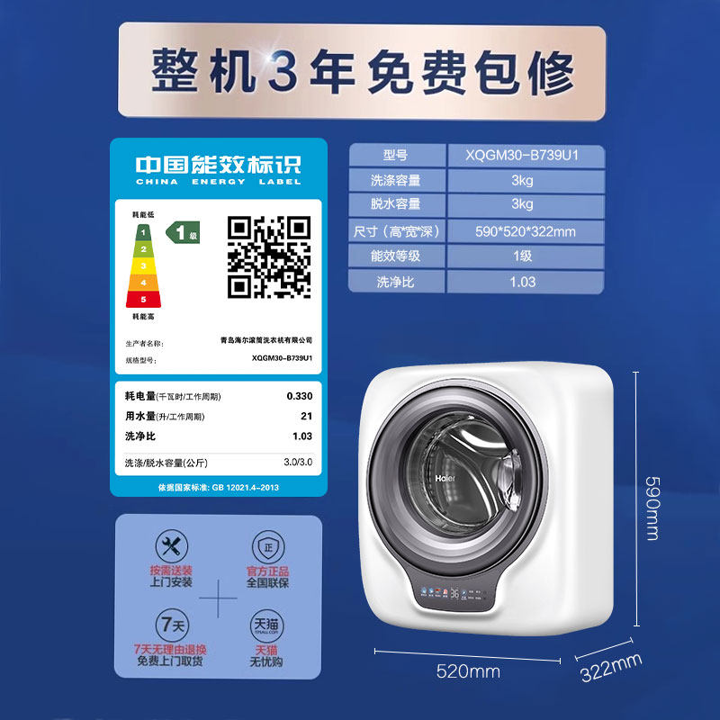 [防跌落]海尔壁挂洗衣机挂壁HPV除菌全自动家用婴儿童内衣裤739